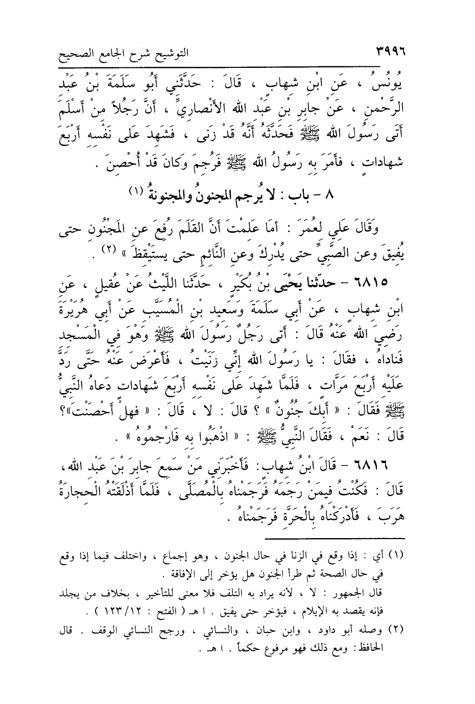 6815 - حَدَّثَنَا يَحْيَى بْنُ بُكَيْرٍ، حَدَّثَنَا اللَّيْثُ، عَنْ عُقَيْلٍ، عَنِ ابْنِ شِهَابٍ، عَنْ أَبِي سَلَمَةَ، وَسَعِيدِ بْنِ المُسَيِّبِ، عَنْ أَبِي هُرَيْرَةَ رَضِيَ اللَّهُ عَنْهُ، قَالَ: أَتَى رَجُلٌ رَسُولَ اللَّهِ صَلَّى اللهُ عَلَيْهِ وَسَلَّمَ وَهُوَ فِي المَسْجِدِ، فَنَادَاهُ فَقَالَ: يَا رَسُولَ اللَّهِ، إِنِّي زَنَيْتُ، فَأَعْرَضَ عَنْهُ حَتَّى رَدَّدَ عَلَيْهِ أَرْبَعَ مَرَّاتٍ، فَلَمَّا شَهِدَ عَلَى نَفْسِهِ أَرْبَعَ شَهَادَاتٍ، دَعَاهُ النَّبِيُّ صَلَّى اللهُ عَلَيْهِ وَسَلَّمَ فَقَالَ: «أَبِكَ جُنُونٌ» قَالَ: لاَ، قَالَ: «فَهَلْ أَحْصَنْتَ» قَالَ: نَعَمْ، فَقَالَ النَّبِيُّ صَلَّى اللهُ عَلَيْهِ وَسَلَّمَ: «اذْهَبُوا بِهِ فَارْجُمُوهُ».