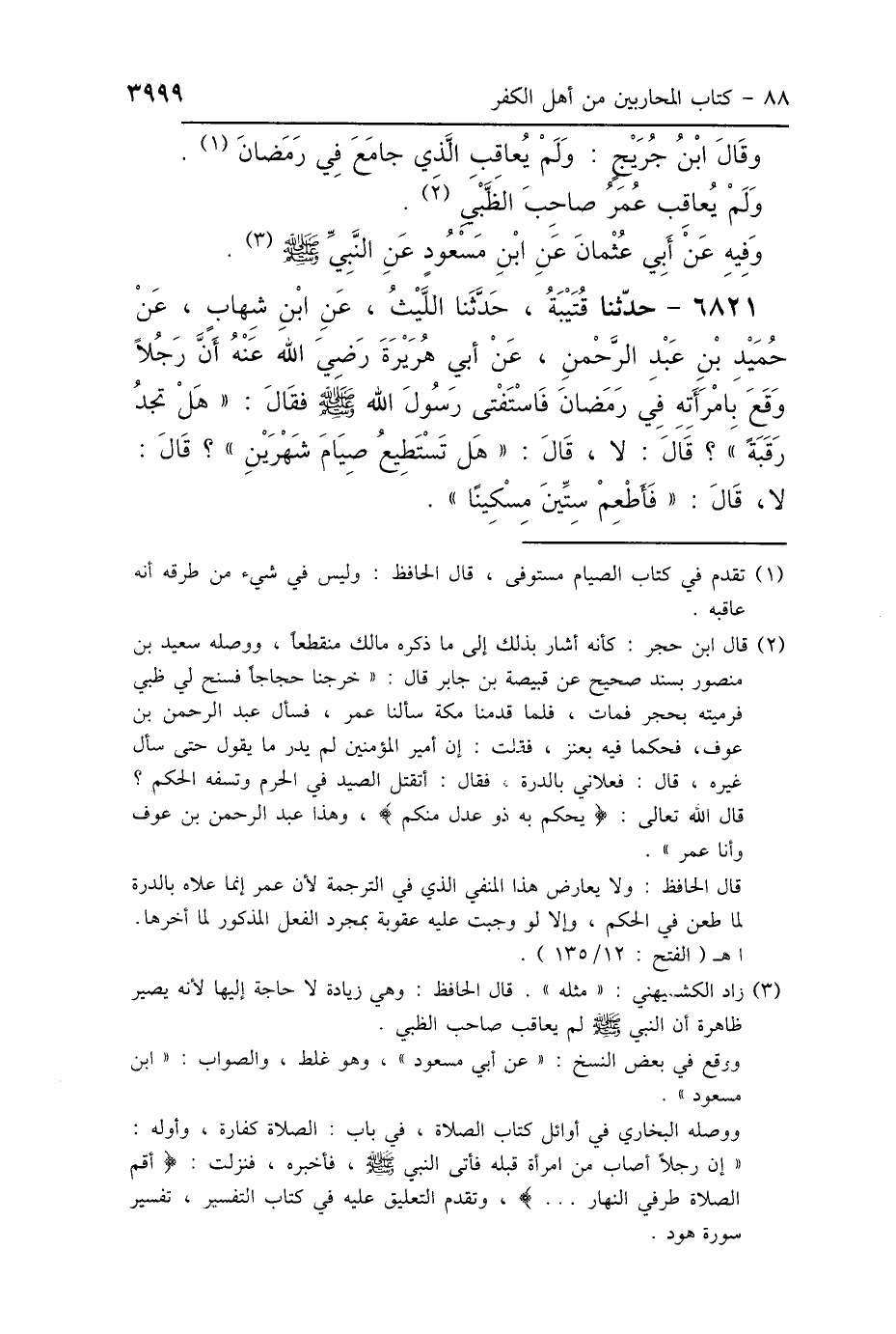 6821 - حَدَّثَنَا قُتَيْبَةُ، حَدَّثَنَا اللَّيْثُ، عَنِ ابْنِ شِهَابٍ، عَنْ حُمَيْدِ بْنِ عَبْدِ الرَّحْمَنِ، عَنْ أَبِي هُرَيْرَةَ رَضِيَ اللَّهُ عَنْهُ، أَنَّ رَجُلًا وَقَعَ بِامْرَأَتِهِ فِي رَمَضَانَ، فَاسْتَفْتَى رَسُولَ اللَّهِ صَلَّى اللهُ عَلَيْهِ وَسَلَّمَ، فَقَالَ: «هَلْ تَجِدُ رَقَبَةً» قَالَ: لاَ، قَالَ: «هَلْ تَسْتَطِيعُ صِيَامَ شَهْرَيْنِ» قَالَ: لاَ، قَالَ: «فَأَطْعِمْ سِتِّينَ مِسْكِينًا».