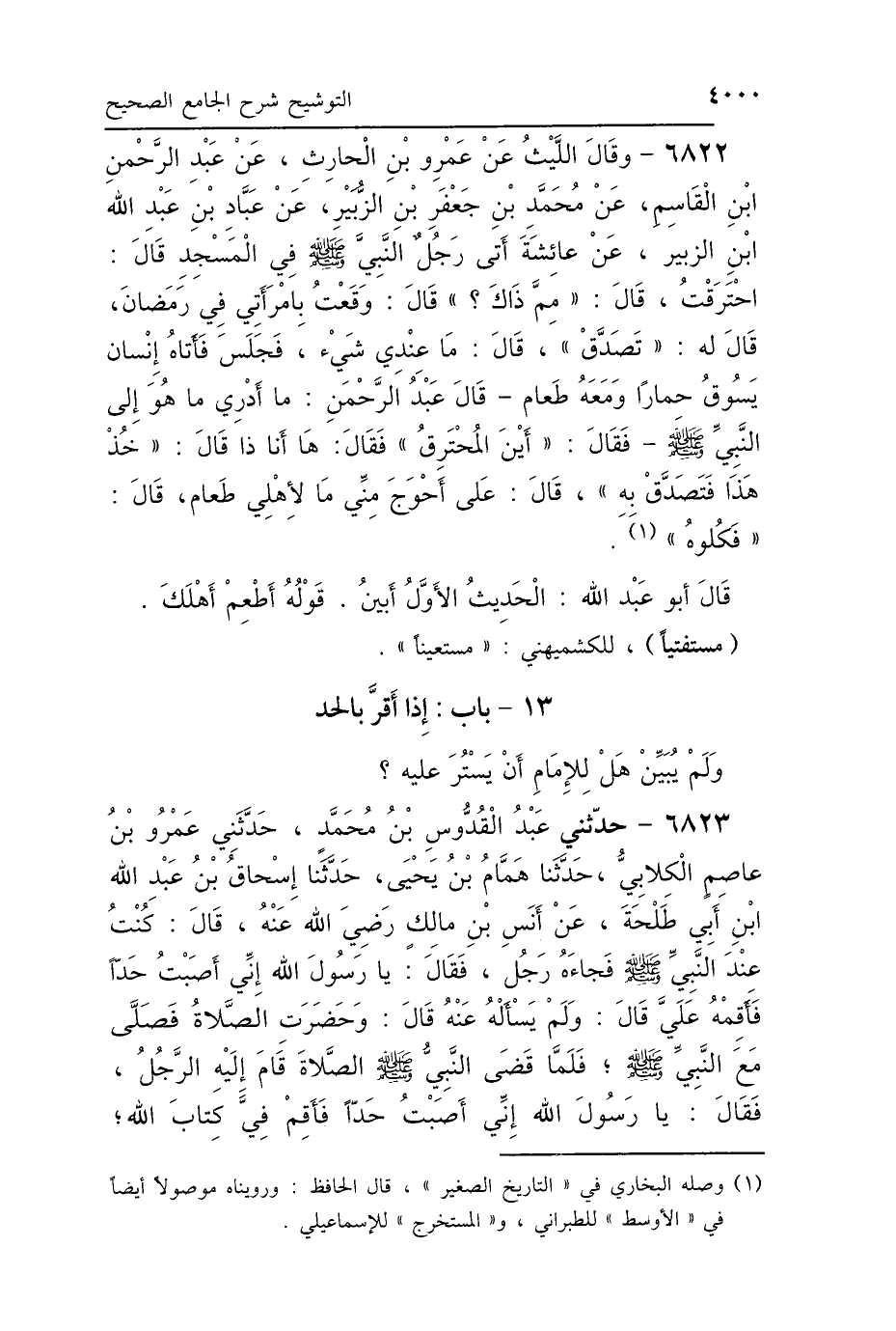 6822 - وَقَالَ اللَّيْثُ: عَنْ عَمْرِو بْنِ الحَارِثِ، عَنْ عَبْدِ الرَّحْمَنِ بْنِ القَاسِمِ، عَنْ مُحَمَّدِ بْنِ جَعْفَرِ بْنِ الزُّبَيْرِ، عَنْ عَبَّادِ بْنِ عَبْدِ اللَّهِ بْنِ الزُّبَيْرِ، عَنْ عَائِشَةَ: أَتَى رَجُلٌ النَّبِيَّ صَلَّى اللهُ عَلَيْهِ وَسَلَّمَ فِي المَسْجِدِ، قَالَ: احْتَرَقْتُ، قَالَ: «مِمَّ ذَاكَ» قَالَ: وَقَعْتُ بِامْرَأَتِي فِي رَمَضَانَ، قَالَ لَهُ: «تَصَدَّقْ» قَالَ: مَا عِنْدِي شَيْءٌ، فَجَلَسَ، وَأَتَاهُ إِنْسَانٌ يَسُوقُ حِمَارًا وَمَعَهُ طَعَامٌ - قَالَ عَبْدُ الرَّحْمَنِ: مَا أَدْرِي مَا هُوَ - إِلَى النَّبِيِّ صَلَّى اللهُ عَلَيْهِ وَسَلَّمَ، فَقَالَ: «أَيْنَ المُحْتَرِقُ» فَقَالَ: هَا أَنَا ذَا، قَالَ: «خُذْ هَذَا فَتَصَدَّقْ بِهِ» قَالَ: عَلَى أَحْوَجَ مِنِّي، مَا لِأَهْلِي طَعَامٌ؟ قَالَ: «فَكُلُوهُ» قَالَ أَبُو عَبْدِ اللَّهِ: الحَدِيثُ الأَوَّلُ أَبْيَنُ، قَوْلُهُ: «أَطْعِمْ أَهْلَكَ».