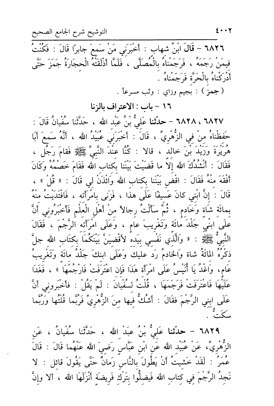 6827 - حَدَّثَنَا عَلِيُّ بْنُ عَبْدِ اللَّهِ، حَدَّثَنَا سُفْيَانُ، قَالَ: حَفِظْنَاهُ مِنْ فِي الزُّهْرِيِّ، قَالَ: أَخْبَرَنِي عُبَيْدُ اللَّهِ: أَنَّهُ سَمِعَ أَبَا هُرَيْرَةَ، وَزَيْدَ بْنَ خَالِدٍ، قَالاَ: كُنَّا عِنْدَ النَّبِيِّ صَلَّى اللهُ عَلَيْهِ وَسَلَّمَ فَقَامَ رَجُلٌ فَقَالَ: أَنْشُدُكَ اللَّهَ إِلَّا قَضَيْتَ بَيْنَنَا بِكِتَابِ اللَّهِ، فَقَامَ خَصْمُهُ، وَكَانَ أَفْقَهَ مِنْهُ، فَقَالَ: اقْضِ بَيْنَنَا بِكِتَابِ اللَّهِ وَأْذَنْ لِي؟ قَالَ: «قُلْ» قَالَ: إِنَّ ابْنِي كَانَ عَسِيفًا عَلَى هَذَا فَزَنَى بِامْرَأَتِهِ، فَافْتَدَيْتُ مِنْهُ بِمِائَةِ شَاةٍ وَخَادِمٍ، ثُمَّ سَأَلْتُ رِجَالًا مِنْ أَهْلِ العِلْمِ، فَأَخْبَرُونِي: أَنَّ عَلَى ابْنِي جَلْدَ مِائَةٍ وَتَغْرِيبَ عَامٍ، وَعَلَى امْرَأَتِهِ الرَّجْمَ. فَقَالَ النَّبِيُّ صَلَّى اللهُ عَلَيْهِ وَسَلَّمَ: «وَالَّذِي نَفْسِي بِيَدِهِ لَأَقْضِيَنَّ بَيْنَكُمَا بِكِتَابِ اللَّهِ جَلَّ ذِكْرُهُ، المِائَةُ شَاةٍ وَالخَادِمُ رَدٌّ، عَلَيْكَ وَعَلَى ابْنِكَ جَلْدُ مِائَةٍ وَتَغْرِيبُ عَامٍ، وَاغْدُ يَا أُنَيْسُ عَلَى امْرَأَةِ هَذَا، فَإِنِ اعْتَرَفَتْ فَارْجُمْهَا» فَغَدَا عَلَيْهَا فَاعْتَرَفَتْ فَرَجَمَهَا قُلْتُ لِسُفْيَانَ: لَمْ يَقُلْ: فَأَخْبَرُونِي أَنَّ عَلَى ابْنِي الرَّجْمَ؟ فَقَالَ: «الشَّكُّ فِيهَا مِنَ الزُّهْرِيِّ، فَرُبَّمَا قُلْتُهَا، وَرُبَّمَا سَكَتُّ».