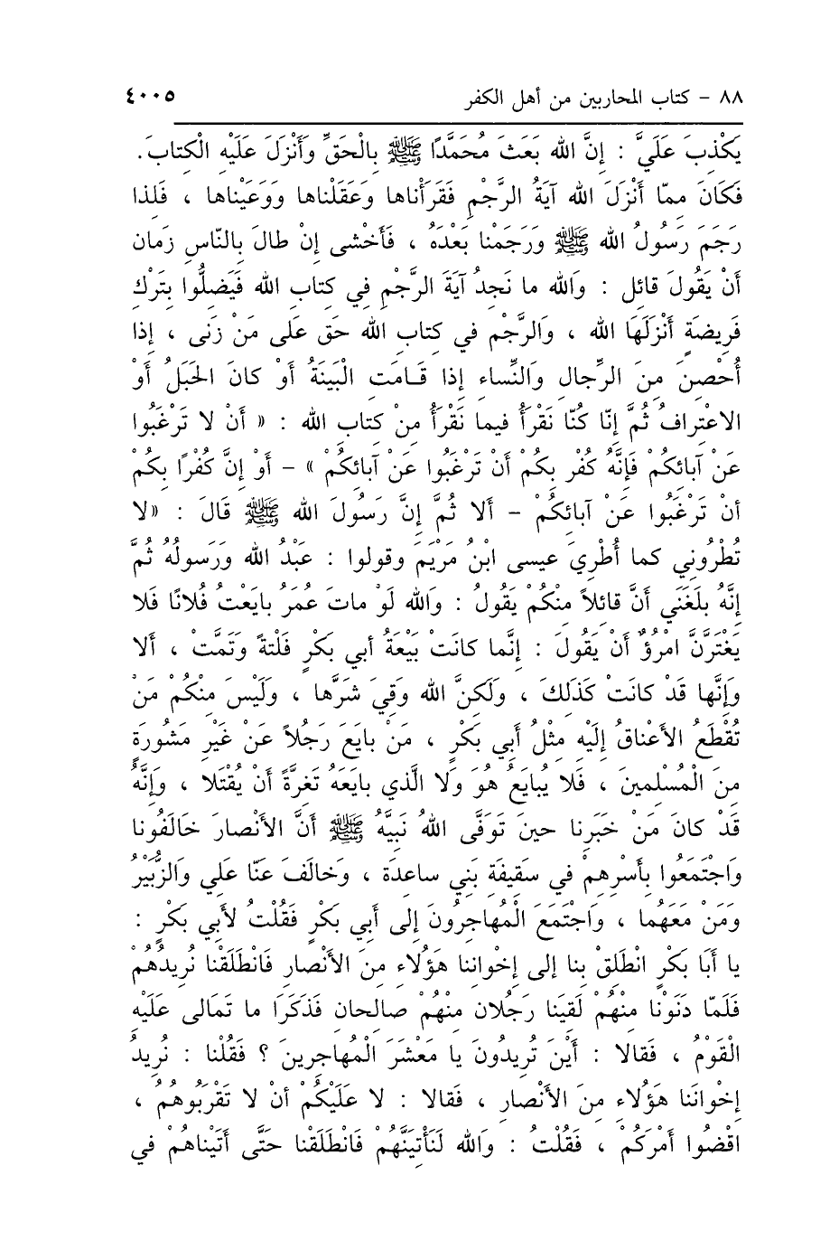 يَكْذِبَ عَلَيَّ: إِنَّ اللَّهَ بَعَثَ مُحَمَّدًا صَلَّى اللهُ عَلَيْهِ وَسَلَّمَ بِالحَقِّ، وَأَنْزَلَ عَلَيْهِ الكِتَابَ، فَكَانَ مِمَّا أَنْزَلَ اللَّهُ آيَةُ الرَّجْمِ، فَقَرَأْنَاهَا وَعَقَلْنَاهَا وَوَعَيْنَاهَا، رَجَمَ رَسُولُ اللَّهِ صَلَّى اللهُ عَلَيْهِ وَسَلَّمَ وَرَجَمْنَا بَعْدَهُ، فَأَخْشَى إِنْ طَالَ بِالنَّاسِ زَمَانٌ أَنْ يَقُولَ قَائِلٌ: وَاللَّهِ مَا نَجِدُ آيَةَ الرَّجْمِ فِي كِتَابِ اللَّهِ، فَيَضِلُّوا بِتَرْكِ فَرِيضَةٍ أَنْزَلَهَا اللَّهُ، وَالرَّجْمُ فِي كِتَابِ اللَّهِ حَقٌّ عَلَى مَنْ زَنَى إِذَا أُحْصِنَ مِنَ الرِّجَالِ وَالنِّسَاءِ، إِذَا قَامَتِ البَيِّنَةُ، أَوْ كَانَ الحَبَلُ أَوِ الِاعْتِرَافُ، ثُمَّ إِنَّا كُنَّا نَقْرَأُ فِيمَا نَقْرَأُ مِنْ كِتَابِ اللَّهِ: أَنْ لاَ تَرْغَبُوا عَنْ آبَائِكُمْ، فَإِنَّهُ كُفْرٌ بِكُمْ أَنْ تَرْغَبُوا عَنْ آبَائِكُمْ، أَوْ إِنَّ كُفْرًا بِكُمْ أَنْ تَرْغَبُوا عَنْ آبَائِكُمْ. أَلاَ ثُمَّ إِنَّ رَسُولَ اللَّهِ صَلَّى اللهُ عَلَيْهِ وَسَلَّمَ قَالَ: " لاَ تُطْرُونِي كَمَا أُطْرِيَ عِيسَى ابْنُ مَرْيَمَ، وَقُولُوا: عَبْدُ اللَّهِ وَرَسُولُهُ " ثُمَّ إِنَّهُ بَلَغَنِي أَنَّ قَائِلًا مِنْكُمْ يَقُولُ: وَاللَّهِ لَوْ قَدْ مَاتَ عُمَرُ بَايَعْتُ فُلاَنًا، فَلاَ يَغْتَرَّنَّ امْرُؤٌ أَنْ يَقُولَ: إِنَّمَا كَانَتْ بَيْعَةُ أَبِي بَكْرٍ فَلْتَةً وَتَمَّتْ، أَلاَ وَإِنَّهَا قَدْ كَانَتْ كَذَلِكَ، وَلَكِنَّ اللَّهَ وَقَى شَرَّهَا، وَلَيْسَ مِنْكُمْ مَنْ تُقْطَعُ الأَعْنَاقُ إِلَيْهِ مِثْلُ أَبِي بَكْرٍ، مَنْ بَايَعَ رَجُلًا عَنْ غَيْرِ مَشُورَةٍ مِنَ المُسْلِمِينَ فَلاَ يُبَايَعُ هُوَ وَلاَ الَّذِي بَايَعَهُ، تَغِرَّةً أَنْ يُقْتَلاَ، وَإِنَّهُ قَدْ كَانَ مِنْ خَبَرِنَا حِينَ تَوَفَّى اللَّهُ نَبِيَّهُ صَلَّى اللهُ عَلَيْهِ وَسَلَّمَ أَنَّ الأَنْصَارَ خَالَفُونَا، وَاجْتَمَعُوا بِأَسْرِهِمْ فِي سَقِيفَةِ بَنِي سَاعِدَةَ، وَخَالَفَ عَنَّا عَلِيٌّ وَالزُّبَيْرُ وَمَنْ مَعَهُمَا، وَاجْتَمَعَ المُهَاجِرُونَ إِلَى أَبِي بَكْرٍ، فَقُلْتُ لِأَبِي بَكْرٍ: يَا أَبَا بَكْرٍ انْطَلِقْ بِنَا إِلَى إِخْوَانِنَا هَؤُلاَءِ مِنَ الأَنْصَارِ، فَانْطَلَقْنَا نُرِيدُهُمْ، فَلَمَّا دَنَوْنَا مِنْهُمْ، لَقِيَنَا مِنْهُمْ رَجُلاَنِ صَالِحَانِ، فَذَكَرَا مَا تَمَالَأَ عَلَيْهِ القَوْمُ، فَقَالاَ: أَيْنَ تُرِيدُونَ يَا مَعْشَرَ المُهَاجِرِينَ؟ فَقُلْنَا: نُرِيدُ إِخْوَانَنَا هَؤُلاَءِ مِنَ الأَنْصَارِ، فَقَالاَ: لاَ عَلَيْكُمْ أَنْ لاَ تَقْرَبُوهُمْ، اقْضُوا أَمْرَكُمْ، فَقُلْتُ: وَاللَّهِ لَنَأْتِيَنَّهُمْ، فَانْطَلَقْنَا حَتَّى أَتَيْنَاهُمْ فِي