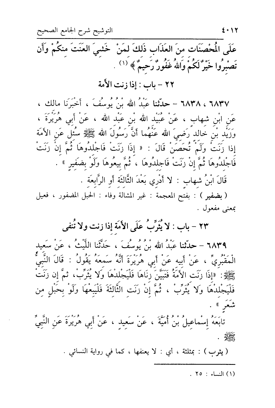 6837، 6838 - حَدَّثَنَا عَبْدُ اللَّهِ بْنُ يُوسُفَ، أَخْبَرَنَا مَالِكٌ، عَنِ ابْنِ شِهَابٍ، عَنْ عُبَيْدِ اللَّهِ بْنِ عَبْدِ اللَّهِ بْنِ عُتْبَةَ، عَنْ أَبِي هُرَيْرَةَ، وَزَيْدِ بْنِ خَالِدٍ، رَضِيَ اللَّهُ عَنْهُمَا: أَنَّ رَسُولَ اللَّهِ صَلَّى اللهُ عَلَيْهِ وَسَلَّمَ سُئِلَ عَنِ الأَمَةِ إِذَا زَنَتْ وَلَمْ تُحْصَنْ؟ قَالَ: «إِذَا زَنَتْ فَاجْلِدُوهَا، ثُمَّ إِنْ زَنَتْ فَاجْلِدُوهَا، ثُمَّ إِنْ زَنَتْ فَاجْلِدُوهَا، ثُمَّ بِيعُوهَا وَلَوْ بِضَفِيرٍ» قَالَ ابْنُ شِهَابٍ: «لاَ أَدْرِي بَعْدَ الثَّالِثَةِ أَوِ الرَّابِعَةِ».
