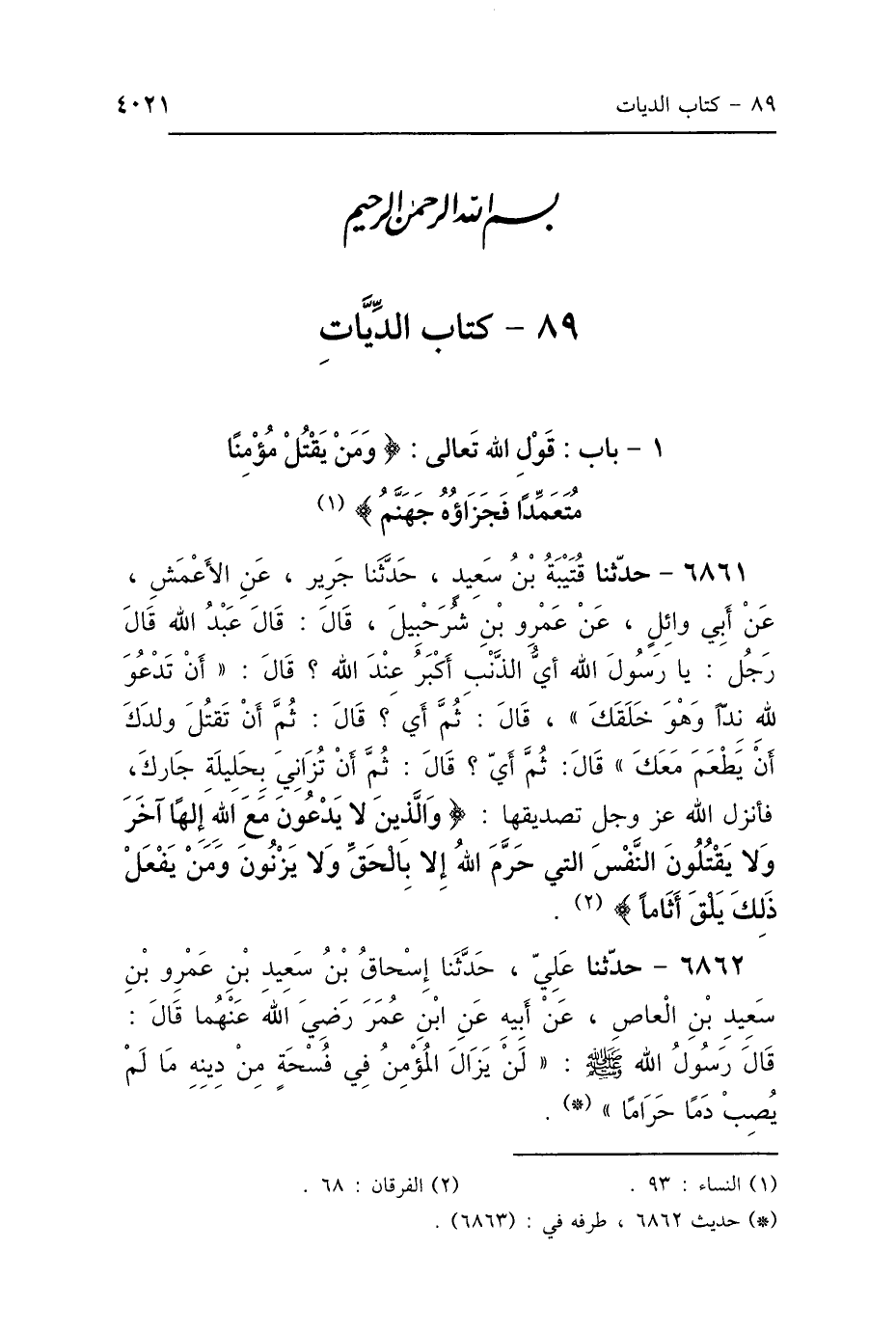 1 - بَابُ قَوْلِ اللَّهِ تَعَالَى: {وَمَنْ يَقْتُلْ مُؤْمِنًا مُتَعَمِّدًا فَجَزَاؤُهُ جَهَنَّمُ} [النساء: 93]