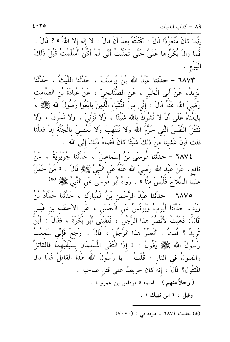 6875 - حَدَّثَنَا عَبْدُ الرَّحْمَنِ بْنُ المُبَارَكِ، حَدَّثَنَا حَمَّادُ بْنُ زَيْدٍ، حَدَّثَنَا أَيُّوبُ، وَيُونُسُ، عَنِ الحَسَنِ، عَنِ الأَحْنَفِ بْنِ قَيْسٍ، قَالَ: ذَهَبْتُ لِأَنْصُرَ هَذَا الرَّجُلَ، فَلَقِيَنِي أَبُو بَكْرَةَ، فَقَالَ: أَيْنَ تُرِيدُ؟ قُلْتُ: أَنْصُرُ هَذَا الرَّجُلَ، قَالَ: ارْجِعْ، فَإِنِّي سَمِعْتُ رَسُولَ اللَّهِ صَلَّى اللهُ عَلَيْهِ وَسَلَّمَ يَقُولُ: «إِذَا التَقَى المُسْلِمَانِ بِسَيْفَيْهِمَا فَالقَاتِلُ وَالمَقْتُولُ فِي النَّارِ» قُلْتُ: يَا رَسُولَ اللَّهِ، هَذَا القَاتِلُ، فَمَا بَالُ المَقْتُولِ؟ قَالَ: «إِنَّهُ كَانَ حَرِيصًا عَلَى قَتْلِ صَاحِبِهِ».
