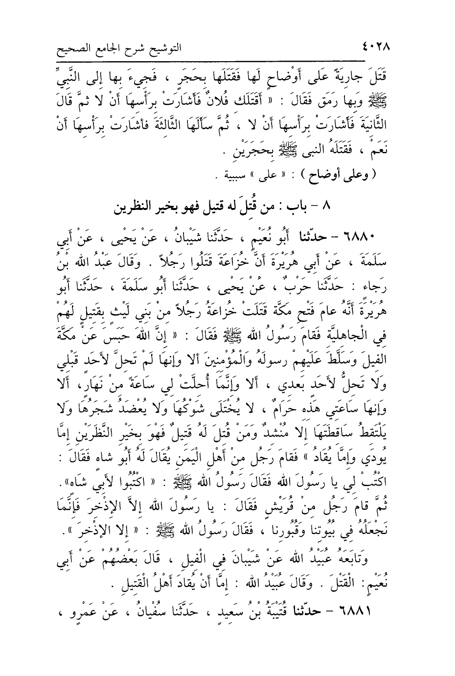 6880 - حَدَّثَنَا أَبُو نُعَيْمٍ، حَدَّثَنَا شَيْبَانُ، عَنْ يَحْيَى، عَنْ أَبِي سَلَمَةَ، عَنْ أَبِي هُرَيْرَةَ: «أَنَّ خُزَاعَةَ قَتَلُوا رَجُلًا» وَقَالَ عَبْدُ اللَّهِ بْنُ رَجَاءٍ، حَدَّثَنَا حَرْبٌ، عَنْ يَحْيَى، حَدَّثَنَا أَبُو سَلَمَةَ، حَدَّثَنَا أَبُو هُرَيْرَةَ: أَنَّهُ عَامَ فَتْحِ مَكَّةَ، قَتَلَتْ خُزَاعَةُ رَجُلًا مِنْ بَنِي لَيْثٍ، بِقَتِيلٍ لَهُمْ فِي الجَاهِلِيَّةِ، فَقَامَ رَسُولُ اللَّهِ صَلَّى اللهُ عَلَيْهِ وَسَلَّمَ فَقَالَ: " إِنَّ اللَّهَ حَبَسَ عَنْ مَكَّةَ الفِيلَ، وَسَلَّطَ عَلَيْهِمْ رَسُولَهُ وَالمُؤْمِنِينَ، أَلاَ وَإِنَّهَا لَمْ تَحِلَّ لِأَحَدٍ قَبْلِي، وَلاَ تَحِلُّ لِأَحَدٍ بَعْدِي، أَلاَ وَإِنَّمَا أُحِلَّتْ لِي سَاعَةً مِنْ نَهَارٍ، أَلاَ وَإِنَّهَا سَاعَتِي هَذِهِ حَرَامٌ، لاَ يُخْتَلَى شَوْكُهَا، وَلاَ يُعْضَدُ شَجَرُهَا، وَلاَ يَلْتَقِطُ سَاقِطَتَهَا إِلَّا مُنْشِدٌ، وَمَنْ قُتِلَ لَهُ قَتِيلٌ فَهُوَ بِخَيْرِ النَّظَرَيْنِ: إِمَّا يُودَى وَإِمَّا يُقَادُ " فَقَامَ رَجُلٌ مِنْ أَهْلِ اليَمَنِ، يُقَالُ لَهُ أَبُو شَاهٍ، فَقَالَ: اكْتُبْ لِي يَا رَسُولَ اللَّهِ. فَقَالَ رَسُولُ اللَّهِ صَلَّى اللهُ عَلَيْهِ وَسَلَّمَ: «اكْتُبُوا لِأَبِي شَاهٍ» ثُمَّ قَامَ رَجُلٌ مِنْ قُرَيْشٍ، فَقَالَ: يَا رَسُولَ اللَّهِ، إِلَّا الإِذْخِرَ، فَإِنَّمَا نَجْعَلُهُ فِي بُيُوتِنَا وَقُبُورِنَا. فَقَالَ رَسُولُ اللَّهِ صَلَّى اللهُ عَلَيْهِ وَسَلَّمَ: «إِلَّا الإِذْخِرَ» وَتَابَعَهُ عُبَيْدُ اللَّهِ، عَنْ شَيْبَانَ فِي الفِيلِ قَالَ بَعْضُهُمْ: عَنْ أَبِي نُعَيْمٍ: «القَتْلَ» وَقَالَ عُبَيْدُ اللَّهِ: «إِمَّا أَنْ يُقَادَ أَهْلُ القَتِيلِ».