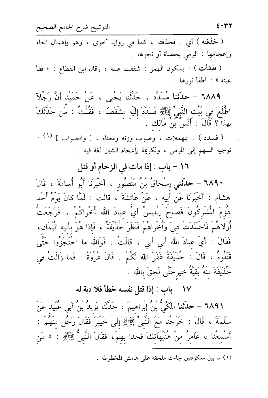 6889 - حَدَّثَنَا مُسَدَّدٌ، حَدَّثَنَا يَحْيَى، عَنْ حُمَيْدٍ: أَنَّ رَجُلًا اطَّلَعَ فِي بَيْتِ النَّبِيِّ صَلَّى اللهُ عَلَيْهِ وَسَلَّمَ «فَسَدَّدَ إِلَيْهِ مِشْقَصًا» فَقُلْتُ: مَنْ حَدَّثَكَ؟ قَالَ: أَنَسُ بْنُ مَالِكٍ.