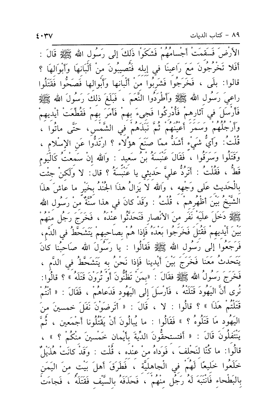 الأَرْضَ فَسَقِمَتْ أَجْسَامُهُمْ، فَشَكَوْا ذَلِكَ إِلَى رَسُولِ اللَّهِ صَلَّى اللهُ عَلَيْهِ وَسَلَّمَ، قَالَ: «أَفَلاَ تَخْرُجُونَ مَعَ رَاعِينَا فِي إِبِلِهِ، فَتُصِيبُونَ مِنْ أَلْبَانِهَا وَأَبْوَالِهَا» قَالُوا: بَلَى، فَخَرَجُوا فَشَرِبُوا مِنْ أَلْبَانِهَا وَأَبْوَالِهَا، فَصَحُّوا، فَقَتَلُوا رَاعِيَ رَسُولِ اللَّهِ صَلَّى اللهُ عَلَيْهِ وَسَلَّمَ وَأَطْرَدُوا النَّعَمَ، فَبَلَغَ ذَلِكَ رَسُولَ اللَّهِ صَلَّى اللهُ عَلَيْهِ وَسَلَّمَ فَأَرْسَلَ فِي آثَارِهِمْ، فَأُدْرِكُوا فَجِيءَ بِهِمْ، فَأَمَرَ بِهِمْ فَقُطِّعَتْ أَيْدِيهِمْ وَأَرْجُلُهُمْ، وَسَمَرَ أَعْيُنَهُمْ، ثُمَّ نَبَذَهُمْ فِي الشَّمْسِ حَتَّى مَاتُوا، قُلْتُ: وَأَيُّ شَيْءٍ أَشَدُّ مِمَّا صَنَعَ هَؤُلاَءِ، ارْتَدُّوا عَنِ الإِسْلاَمِ، وَقَتَلُوا وَسَرَقُوا. فَقَالَ عَنْبَسَةُ بْنُ سَعِيدٍ: وَاللَّهِ إِنْ سَمِعْتُ كَاليَوْمِ قَطُّ، فَقُلْتُ: أَتَرُدُّ عَلَيَّ حَدِيثِي يَا عَنْبَسَةُ؟ قَالَ: لاَ، وَلَكِنْ جِئْتَ بِالحَدِيثِ عَلَى وَجْهِهِ، وَاللَّهِ لاَ يَزَالُ هَذَا الجُنْدُ بِخَيْرٍ مَا عَاشَ هَذَا الشَّيْخُ بَيْنَ أَظْهُرِهِمْ، قُلْتُ: وَقَدْ كَانَ فِي هَذَا سُنَّةٌ مِنْ رَسُولِ اللَّهِ صَلَّى اللهُ عَلَيْهِ وَسَلَّمَ، دَخَلَ عَلَيْهِ نَفَرٌ مِنَ الأَنْصَارِ، فَتَحَدَّثُوا عِنْدَهُ، فَخَرَجَ رَجُلٌ مِنْهُمْ بَيْنَ أَيْدِيهِمْ فَقُتِلَ، فَخَرَجُوا بَعْدَهُ، فَإِذَا هُمْ بِصَاحِبِهِمْ يَتَشَحَّطُ فِي الدَّمِ، فَرَجَعُوا إِلَى رَسُولِ اللَّهِ صَلَّى اللهُ عَلَيْهِ وَسَلَّمَ فَقَالُوا: يَا رَسُولَ اللَّهِ، صَاحِبُنَا كَانَ تَحَدَّثَ مَعَنَا، فَخَرَجَ بَيْنَ أَيْدِينَا، فَإِذَا نَحْنُ بِهِ يَتَشَحَّطُ فِي الدَّمِ، فَخَرَجَ رَسُولُ اللَّهِ صَلَّى اللهُ عَلَيْهِ وَسَلَّمَ فَقَالَ: «بِمَنْ تَظُنُّونَ، أَوْ مَنْ تَرَوْنَ، قَتَلَهُ» قَالُوا: نَرَى أَنَّ اليَهُودَ قَتَلَتْهُ، فَأَرْسَلَ إِلَى اليَهُودِ فَدَعَاهُمْ، فَقَالَ: «آنْتُمْ قَتَلْتُمْ هَذَا؟» قَالُوا: لاَ، قَالَ: «أَتَرْضَوْنَ نَفْلَ خَمْسِينَ مِنَ اليَهُودِ مَا قَتَلُوهُ» فَقَالُوا: مَا يُبَالُونَ أَنْ يَقْتُلُونَا أَجْمَعِينَ، ثُمَّ يَنْتَفِلُونَ، قَالَ: «أَفَتَسْتَحِقُّونَ الدِّيَةَ بِأَيْمَانِ خَمْسِينَ مِنْكُمْ» قَالُوا: مَا كُنَّا لِنَحْلِفَ، فَوَدَاهُ مِنْ عِنْدِهِ، قُلْتُ: وَقَدْ كَانَتْ هُذَيْلٌ خَلَعُوا خَلِيعًا لَهُمْ فِي الجَاهِلِيَّةِ، فَطَرَقَ أَهْلَ بَيْتٍ مِنَ اليَمَنِ بِالْبَطْحَاءِ، فَانْتَبَهَ لَهُ رَجُلٌ مِنْهُمْ، فَحَذَفَهُ بِالسَّيْفِ فَقَتَلَهُ، فَجَاءَتْ