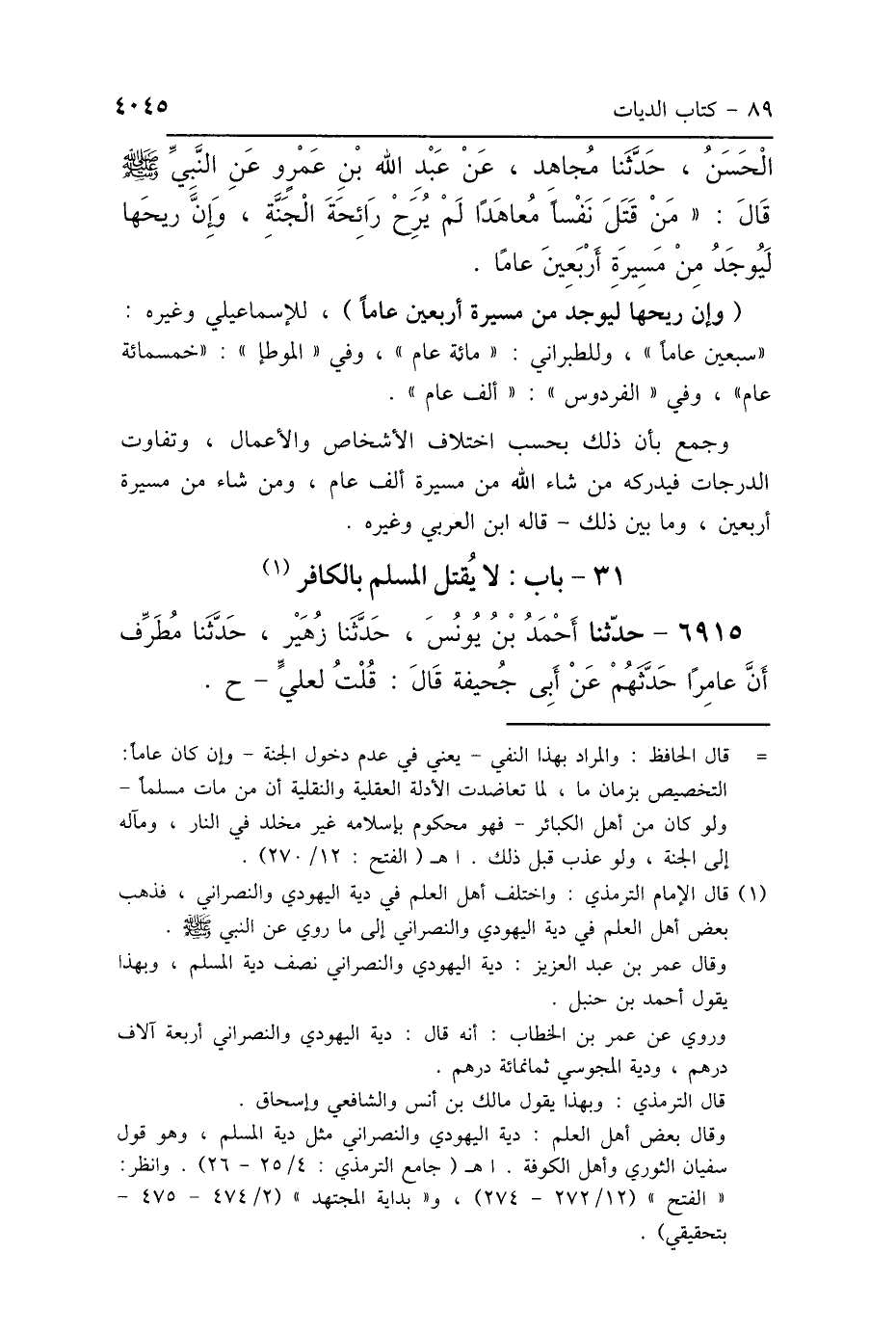 الحَسَنُ، حَدَّثَنَا مُجَاهِدٌ، عَنْ عَبْدِ اللَّهِ بْنِ عَمْرٍو، عَنِ النَّبِيِّ صَلَّى اللهُ عَلَيْهِ وَسَلَّمَ، قَالَ: «مَنْ قَتَلَ نَفْسًا مُعَاهَدًا لَمْ يَرِحْ رَائِحَةَ الجَنَّةِ، وَإِنَّ رِيحَهَا لَيُوجَدُ مِنْ مَسِيرَةِ أَرْبَعِينَ عَامًا».