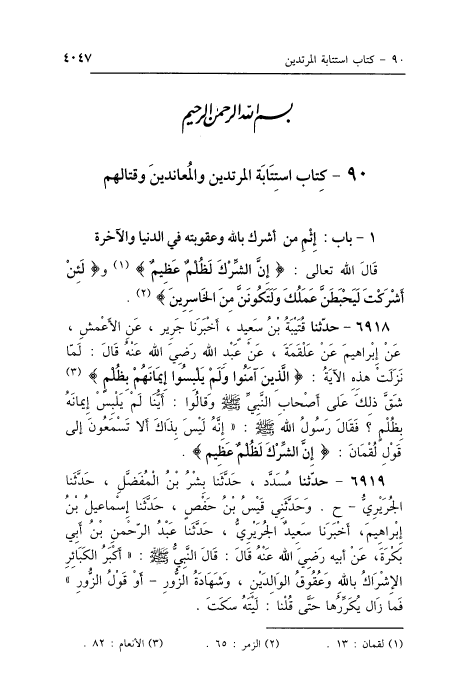 6918 - حَدَّثَنَا قُتَيْبَةُ بْنُ سَعِيدٍ، حَدَّثَنَا جَرِيرٌ، عَنِ الأَعْمَشِ، عَنْ إِبْرَاهِيمَ، عَنْ عَلْقَمَةَ، عَنْ عَبْدِ اللَّهِ رَضِيَ اللَّهُ عَنْهُ، قَالَ: لَمَّا نَزَلَتْ هَذِهِ الآيَةُ: {الَّذِينَ آمَنُوا وَلَمْ يَلْبِسُوا إِيمَانَهُمْ بِظُلْمٍ} [الأنعام: 82] شَقَّ ذَلِكَ عَلَى أَصْحَابِ النَّبِيِّ صَلَّى اللهُ عَلَيْهِ وَسَلَّمَ، وَقَالُوا: أَيُّنَا لَمْ يَلْبِسْ إِيمَانَهُ بِظُلْمٍ؟ فَقَالَ رَسُولُ اللَّهِ صَلَّى اللهُ عَلَيْهِ وَسَلَّمَ: " إِنَّهُ لَيْسَ بِذَاكَ، أَلاَ تَسْمَعُونَ إِلَى قَوْلِ لُقْمَانَ: {إِنَّ الشِّرْكَ} [لقمان: 13] لَظُلْمٌ عَظِيمٌ.