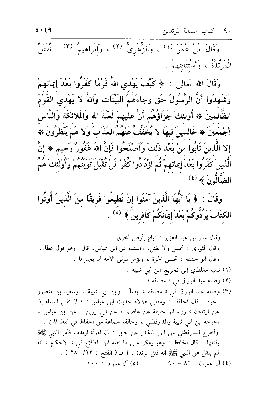 وَقَالَ ابْنُ عُمَرَ وَالزُّهْرِيُّ، وَإِبْرَاهِيمُ: «تُقْتَلُ المُرْتَدَّةُ» وَقَالَ اللَّهُ تَعَالَى: {كَيْفَ يَهْدِي اللَّهُ قَوْمًا كَفَرُوا بَعْدَ إِيمَانِهِمْ وَشَهِدُوا أَنَّ الرَّسُولَ حَقٌّ وَجَاءَهُمُ البَيِّنَاتُ وَاللَّهُ لاَ يَهْدِي القَوْمَ الظَّالِمِينَ أُولَئِكَ جَزَاؤُهُمْ أَنَّ عَلَيْهِمْ لَعْنَةَ اللَّهِ وَالمَلاَئِكَةِ وَالنَّاسِ أَجْمَعِينَ خَالِدِينَ فِيهَا لاَ يُخَفَّفُ عَنْهُمُ العَذَابُ وَلاَ هُمْ يُنْظَرُونَ إِلَّا الَّذِينَ تَابُوا مِنْ بَعْدِ ذَلِكَ وَأَصْلَحُوا فَإِنَّ اللَّهَ غَفُورٌ رَحِيمٌ إِنَّ الَّذِينَ كَفَرُوا بَعْدَ إِيمَانِهِمْ ثُمَّ ازْدَادُوا كُفْرًا لَنْ تُقْبَلَ تَوْبَتُهُمْ وَأُولَئِكَ هُمُ الضَّالُّونَ} [آل عمران: 87] وَقَالَ: {يَا أَيُّهَا الَّذِينَ آمَنُوا إِنْ تُطِيعُوا فَرِيقًا مِنَ الَّذِينَ أُوتُوا الكِتَابَ يَرُدُّوكُمْ بَعْدَ إِيمَانِكُمْ كَافِرِينَ} [آل عمران: 100].