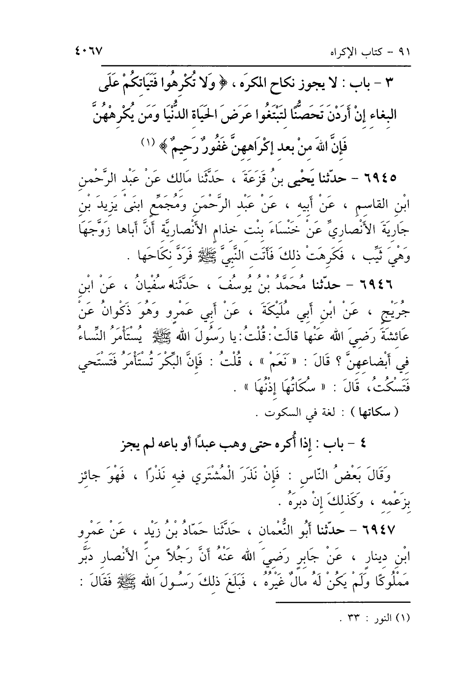 3 - بَابُ لاَ يَجُوزُ نِكَاحُ المُكْرَهِ، {وَلاَ تُكْرِهُوا فَتَيَاتِكُمْ عَلَى البِغَاءِ إِنْ أَرَدْنَ تَحَصُّنًا لِتَبْتَغُوا عَرَضَ الحَيَاةِ الدُّنْيَا وَمَنْ يُكْرِهْهُنَّ فَإِنَّ اللَّهَ مِنْ بَعْدِ إِكْرَاهِهِنَّ غَفُورٌ رَحِيمٌ} [النور: 33]
