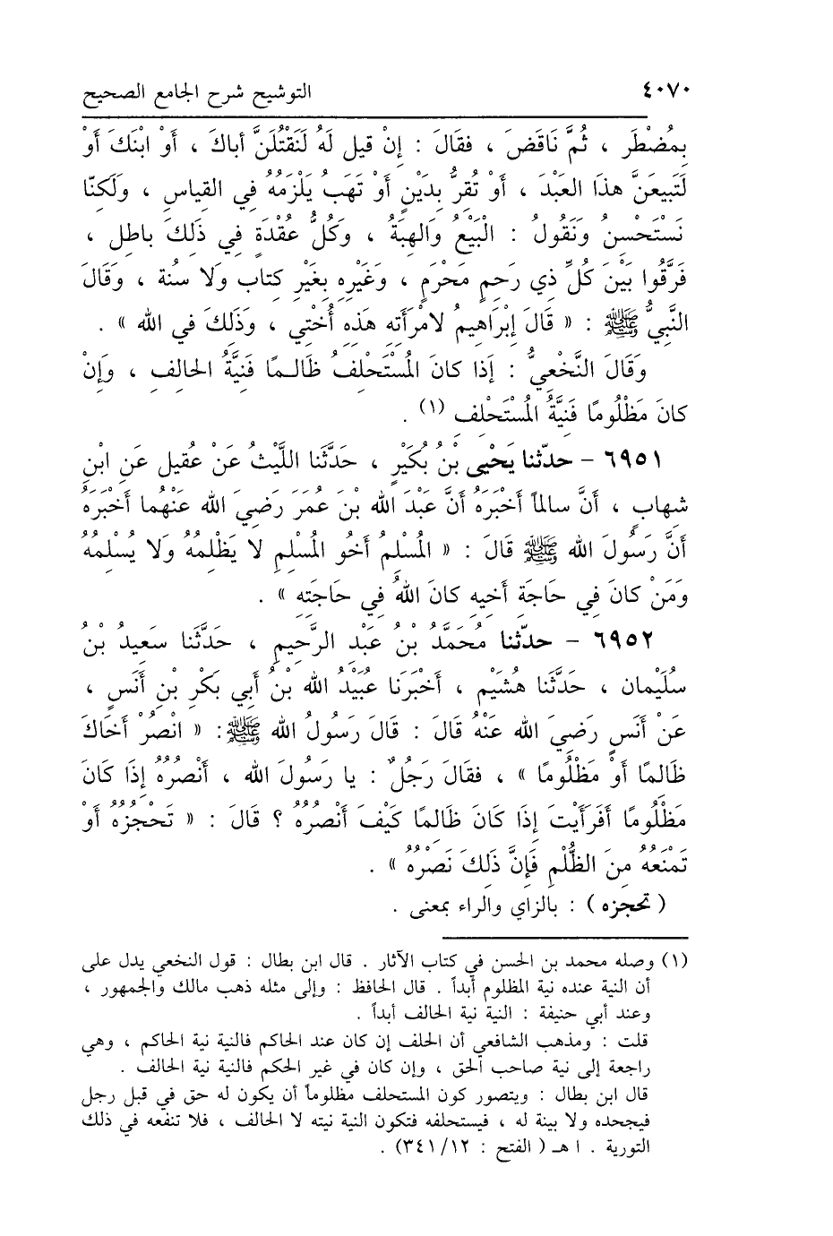 بِمُضْطَرٍّ. ثُمَّ نَاقَضَ فَقَالَ: إِنْ قِيلَ لَهُ: لَنَقْتُلَنَّ أَبَاكَ أَوِ ابْنَكَ، أَوْ لَتَبِيعَنَّ هَذَا العَبْدَ، أَوْ تُقِرُّ بِدَيْنٍ أَوْ تَهَبُ، يَلْزَمُهُ فِي القِيَاسِ، وَلَكِنَّا نَسْتَحْسِنُ وَنَقُولُ: البَيْعُ وَالهِبَةُ، وَكُلُّ عُقْدَةٍ فِي ذَلِكَ بَاطِلٌ. فَرَّقُوا بَيْنَ كُلِّ ذِي رَحِمٍ مُحَرَّمٍ، وَغَيْرِهِ، بِغَيْرِ كِتَابٍ وَلاَ سُنَّةٍ "وَقَالَ النَّبِيُّ صَلَّى اللهُ عَلَيْهِ وَسَلَّمَ: " قَالَ إِبْرَاهِيمُ لِامْرَأَتِهِ: هَذِهِ أُخْتِي، وَذَلِكَ فِي اللَّهِ " وَقَالَ النَّخَعِيُّ: «إِذَا كَانَ المُسْتَحْلِفُ ظَالِمًا فَنِيَّةُ الحَالِفِ، وَإِنْ كَانَ مَظْلُومًا فَنِيَّةُ المُسْتَحْلِفِ».