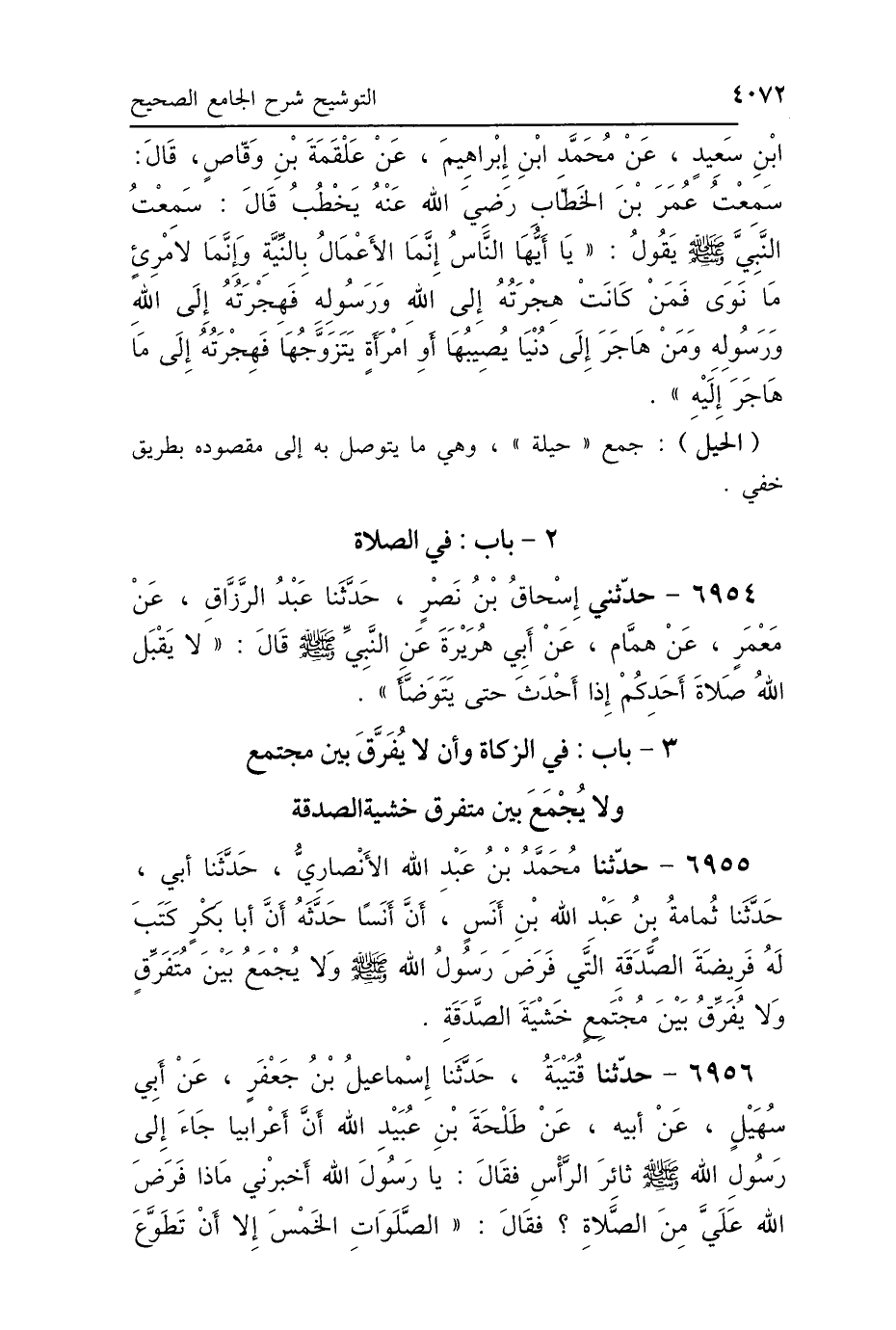 بْنِ سَعِيدٍ، عَنْ مُحَمَّدِ بْنِ إِبْرَاهِيمَ، عَنْ عَلْقَمَةَ بْنِ وَقَّاصٍ، قَالَ: سَمِعْتُ عُمَرَ بْنَ الخَطَّابِ رَضِيَ اللَّهُ عَنْهُ، يَخْطُبُ قَالَ: سَمِعْتُ النَّبِيَّ صَلَّى اللهُ عَلَيْهِ وَسَلَّمَ يَقُولُ: «يَا أَيُّهَا النَّاسُ، إِنَّمَا الأَعْمَالُ بِالنِّيَّةِ، وَإِنَّمَا لِامْرِئٍ مَا نَوَى، فَمَنْ كَانَتْ هِجْرَتُهُ إِلَى اللَّهِ وَرَسُولِهِ، فَهِجْرَتُهُ إِلَى اللَّهِ وَرَسُولِهِ، وَمَنْ هَاجَرَ إِلَى دُنْيَا يُصِيبُهَا أَوِ امْرَأَةٍ يَتَزَوَّجُهَا، فَهِجْرَتُهُ إِلَى مَا هَاجَرَ إِلَيْهِ».