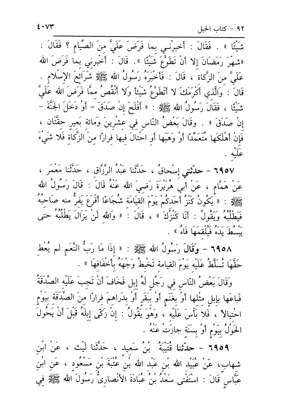 6958 - وَقَالَ رَسُولُ اللَّهِ صَلَّى اللهُ عَلَيْهِ وَسَلَّمَ: «إِذَا مَا رَبُّ النَّعَمِ لَمْ يُعْطِ حَقَّهَا تُسَلَّطُ عَلَيْهِ يَوْمَ القِيَامَةِ، فَتَخْبِطُ وَجْهَهُ بِأَخْفَافِهَا» وَقَالَ بَعْضُ النَّاسِ: " فِي رَجُلٍ لَهُ إِبِلٌ، فَخَافَ أَنْ تَجِبَ عَلَيْهِ الصَّدَقَةُ، فَبَاعَهَا بِإِبِلٍ مِثْلِهَا أَوْ بِغَنَمٍ أَوْ بِبَقَرٍ أَوْ بِدَرَاهِمَ، فِرَارًا مِنَ الصَّدَقَةِ بِيَوْمٍ احْتِيَالًا، فَلاَ بَأْسَ عَلَيْهِ. وَهُوَ يَقُولُ: إِنْ زَكَّى إِبِلَهُ قَبْلَ أَنْ يَحُولَ الحَوْلُ بِيَوْمٍ أَوْ بِسِتَّةٍ جَازَتْ عَنْهُ.