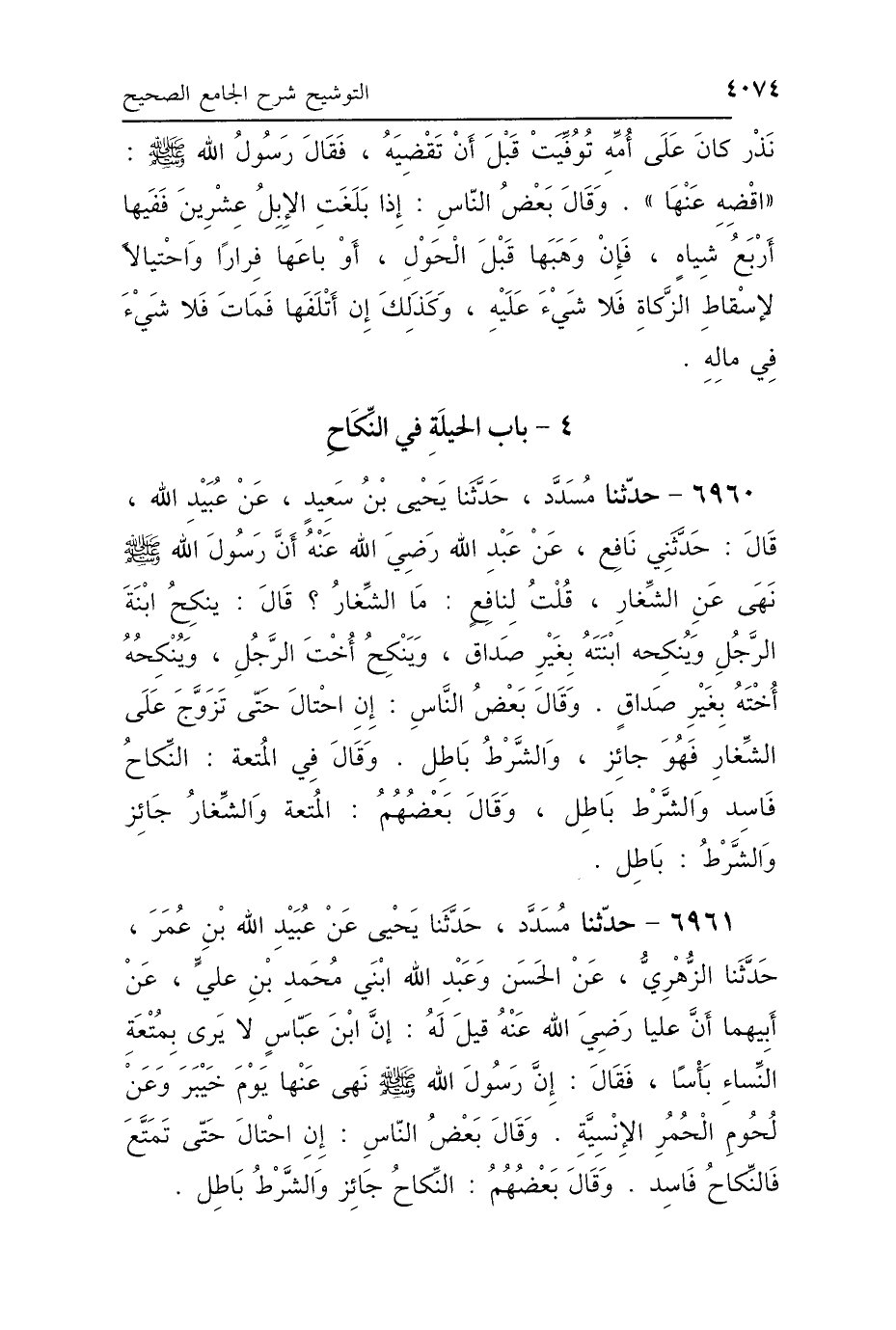 6960 - حَدَّثَنَا مُسَدَّدٌ، حَدَّثَنَا يَحْيَى بْنُ سَعِيدٍ، عَنْ عُبَيْدِ اللَّهِ، قَالَ: حَدَّثَنِي نَافِعٌ، عَنْ عَبْدِ اللَّهِ رَضِيَ اللَّهُ عَنْهُ أَنَّ رَسُولَ اللَّهِ صَلَّى اللهُ عَلَيْهِ وَسَلَّمَ «نَهَى عَنِ الشِّغَارِ» قُلْتُ لِنَافِعٍ: مَا الشِّغَارُ؟ قَالَ: «يَنْكِحُ ابْنَةَ الرَّجُلِ وَيُنْكِحُهُ ابْنَتَهُ بِغَيْرِ صَدَاقٍ، وَيَنْكِحُ أُخْتَ الرَّجُلِ وَيُنْكِحُهُ أُخْتَهُ بِغَيْرِ صَدَاقٍ» وَقَالَ بَعْضُ النَّاسِ «إِنِ احْتَالَ حَتَّى تَزَوَّجَ عَلَى الشِّغَارِ فَهُوَ جَائِزٌ وَالشَّرْطُ بَاطِلٌ» وَقَالَ فِي المُتْعَةِ: «النِّكَاحُ فَاسِدٌ وَالشَّرْطُ بَاطِلٌ». وَقَالَ بَعْضُهُمْ: «المُتْعَةُ وَالشِّغَارُ جَائِزٌ وَالشَّرْطُ بَاطِلٌ».