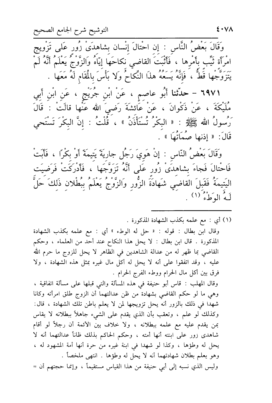 6971 - حَدَّثَنَا أَبُو عَاصِمٍ، عَنِ ابْنِ جُرَيْجٍ، عَنِ ابْنِ أَبِي مُلَيْكَةَ، عَنْ ذَكْوَانَ، عَنْ عَائِشَةَ رَضِيَ اللَّهُ عَنْهَا، قَالَتْ: قَالَ رَسُولُ اللَّهِ صَلَّى اللهُ عَلَيْهِ وَسَلَّمَ: «البِكْرُ تُسْتَأْذَنُ» قُلْتُ: إِنَّ البِكْرَ تَسْتَحْيِي؟ قَالَ: «إِذْنُهَا صُمَاتُهَا» وَقَالَ بَعْضُ النَّاسِ: «إِنْ هَوِيَ رَجُلٌ جَارِيَةً يَتِيمَةً أَوْ بِكْرًا، فَأَبَتْ، فَاحْتَالَ فَجَاءَ بِشَاهِدَيْ زُورٍ عَلَى أَنَّهُ تَزَوَّجَهَا، فَأَدْرَكَتْ، فَرَضِيَتِ اليَتِيمَةُ، فَقَبِلَ القَاضِي شَهَادَةَ الزُّورِ، وَالزَّوْجُ يَعْلَمُ بِبُطْلاَنِ ذَلِكَ، حَلَّ لَهُ الوَطْءُ».