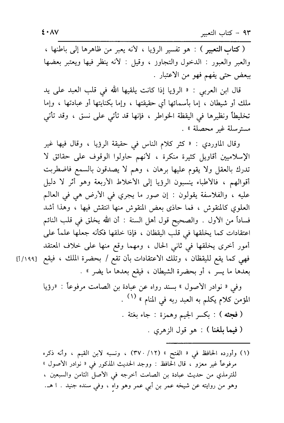 وفي "نوادر الأصول" بسند رواه عن عبادة بن الصامت مرفوعًا: "رؤيا المؤمن كلام يكلم به العبد ربه في المنام".