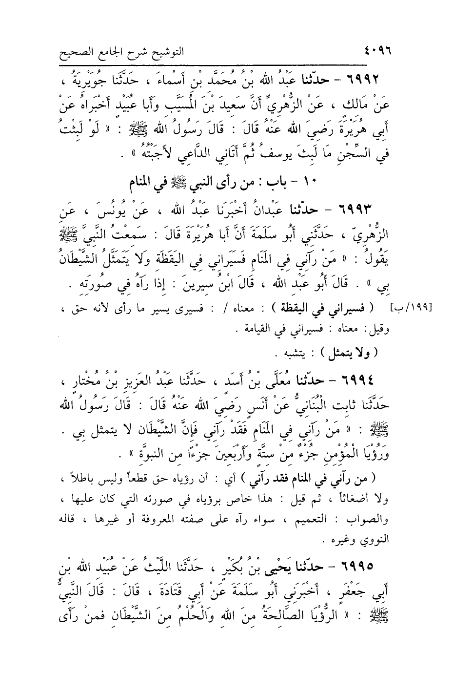 6994 - حَدَّثَنَا مُعَلَّى بْنُ أَسَدٍ، حَدَّثَنَا عَبْدُ العَزِيزِ بْنُ مُخْتَارٍ، حَدَّثَنَا ثَابِتٌ البُنَانِيُّ، عَنْ أَنَسٍ رَضِيَ اللَّهُ عَنْهُ، قَالَ: قَالَ النَّبِيُّ صَلَّى اللهُ عَلَيْهِ وَسَلَّمَ: «مَنْ رَآنِي فِي المَنَامِ فَقَدْ رَآنِي، فَإِنَّ الشَّيْطَانَ لاَ يَتَخَيَّلُ بِي، وَرُؤْيَا المُؤْمِنِ جُزْءٌ مِنْ سِتَّةٍ وَأَرْبَعِينَ جُزْءًا مِنَ النُّبُوَّةِ».