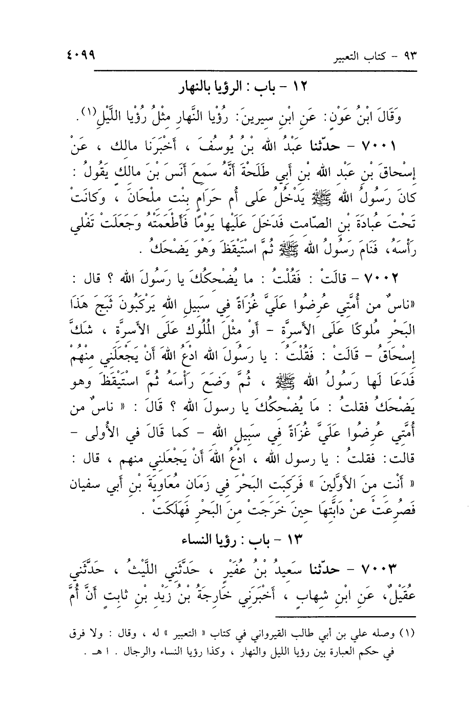 7002 - قَالَتْ: فَقُلْتُ: مَا يُضْحِكُكَ يَا رَسُولَ اللَّهِ؟ قَالَ: " نَاسٌ مِنْ أُمَّتِي عُرِضُوا عَلَيَّ غُزَاةً فِي سَبِيلِ اللَّهِ، يَرْكَبُونَ ثَبَجَ هَذَا البَحْرِ، مُلُوكًا عَلَى الأَسِرَّةِ، أَوْ: مِثْلَ المُلُوكِ عَلَى الأَسِرَّةِ " - شَكَّ إِسْحَاقُ - قَالَتْ: فَقُلْتُ: يَا رَسُولَ اللَّهِ، ادْعُ اللَّهَ أَنْ يَجْعَلَنِي مِنْهُمْ، فَدَعَا لَهَا رَسُولُ اللَّهِ صَلَّى اللهُ عَلَيْهِ وَسَلَّمَ، ثُمَّ وَضَعَ رَأْسَهُ ثُمَّ اسْتَيْقَظَ وَهُوَ يَضْحَكُ، فَقُلْتُ: مَا يُضْحِكُكَ يَا رَسُولَ اللَّهِ؟ قَالَ: «نَاسٌ مِنْ أُمَّتِي عُرِضُوا عَلَيَّ غُزَاةً فِي سَبِيلِ اللَّهِ» كَمَا قَالَ فِي الأُولَى، قَالَتْ: فَقُلْتُ: يَا رَسُولَ اللَّهِ ادْعُ اللَّهَ أَنْ يَجْعَلَنِي مِنْهُمْ، قَالَ: «أَنْتِ مِنَ الأَوَّلِينَ» فَرَكِبَتِ البَحْرَ فِي زَمَانِ مُعَاوِيَةَ بْنِ أَبِي سُفْيَانَ، فَصُرِعَتْ عَنْ دَابَّتِهَا حِينَ خَرَجَتْ مِنَ البَحْرِ، فَهَلَكَتْ.