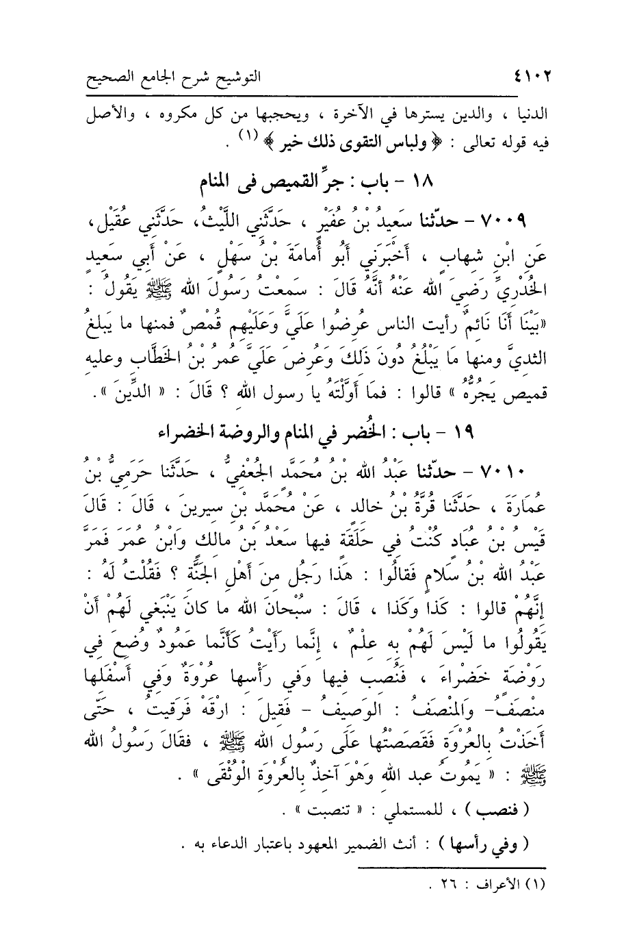 7010 - حَدَّثَنَا عَبْدُ اللَّهِ بْنُ مُحَمَّدٍ الجُعْفِيُّ، حَدَّثَنَا حَرَمِيُّ بْنُ عُمَارَةَ، حَدَّثَنَا قُرَّةُ بْنُ خَالِدٍ، عَنْ مُحَمَّدِ بْنِ سِيرِينَ، قَالَ: قَالَ قَيْسُ بْنُ عُبَادٍ: كُنْتُ فِي حَلْقَةٍ فِيهَا سَعْدُ بْنُ مَالِكٍ وَابْنُ عُمَرَ، فَمَرَّ عَبْدُ اللَّهِ بْنُ سَلاَمٍ، فَقَالُوا: هَذَا رَجُلٌ مِنْ أَهْلِ الجَنَّةِ، فَقُلْتُ لَهُ: إِنَّهُمْ قَالُوا كَذَا وَكَذَا، قَالَ: سُبْحَانَ اللَّهِ، مَا كَانَ يَنْبَغِي لَهُمْ أَنْ يَقُولُوا مَا لَيْسَ لَهُمْ بِهِ عِلْمٌ، إِنَّمَا رَأَيْتُ كَأَنَّمَا عَمُودٌ وُضِعَ فِي رَوْضَةٍ خَضْرَاءَ فَنُصِبَ فِيهَا، وَفِي رَأْسِهَا عُرْوَةٌ، وَفِي أَسْفَلِهَا مِنْصَفٌ، وَالمِنْصَفُ الوَصِيفُ، فَقِيلَ: ارْقَهْ، فَرَقِيتُهُ حَتَّى أَخَذْتُ بِالعُرْوَةِ، فَقَصَصْتُهَا عَلَى رَسُولِ اللَّهِ صَلَّى اللهُ عَلَيْهِ وَسَلَّمَ، فَقَالَ رَسُولُ اللَّهِ صَلَّى اللهُ عَلَيْهِ وَسَلَّمَ: «يَمُوتُ عَبْدُ اللَّهِ وَهُوَ آخِذٌ بِالعُرْوَةِ الوُثْقَى».