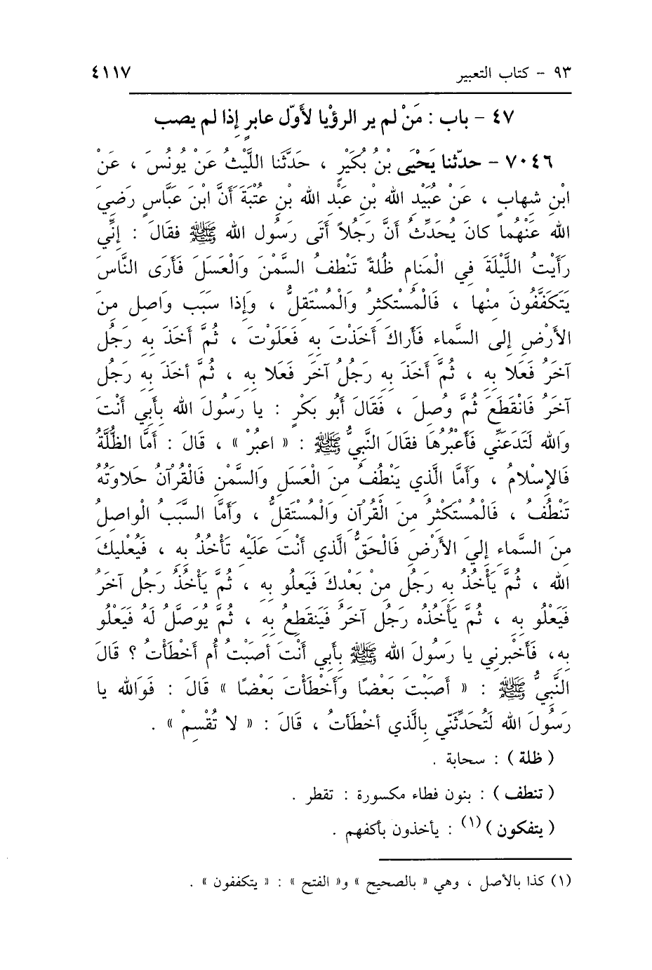 7046 - حَدَّثَنَا يَحْيَى بْنُ بُكَيْرٍ، حَدَّثَنَا اللَّيْثُ، عَنْ يُونُسَ، عَنِ ابْنِ شِهَابٍ، عَنْ عُبَيْدِ اللَّهِ بْنِ عَبْدِ اللَّهِ بْنِ عُتْبَةَ، أَنَّ ابْنَ عَبَّاسٍ، رَضِيَ اللَّهُ عَنْهُمَا، كَانَ يُحَدِّثُ: أَنَّ رَجُلًا أَتَى رَسُولَ اللَّهِ صَلَّى اللهُ عَلَيْهِ وَسَلَّمَ فَقَالَ: إِنِّي رَأَيْتُ اللَّيْلَةَ فِي المَنَامِ ظُلَّةً تَنْطُفُ السَّمْنَ وَالعَسَلَ، فَأَرَى النَّاسَ يَتَكَفَّفُونَ مِنْهَا، فَالْمُسْتَكْثِرُ وَالمُسْتَقِلُّ، وَإِذَا سَبَبٌ وَاصِلٌ مِنَ الأَرْضِ إِلَى السَّمَاءِ، فَأَرَاكَ أَخَذْتَ بِهِ فَعَلَوْتَ، ثُمَّ أَخَذَ بِهِ رَجُلٌ آخَرُ فَعَلاَ بِهِ، ثُمَّ أَخَذَ بِهِ رَجُلٌ آخَرُ فَعَلاَ بِهِ، ثُمَّ أَخَذَ بِهِ رَجُلٌ آخَرُ فَانْقَطَعَ ثُمَّ وُصِلَ. فَقَالَ أَبُو بَكْرٍ: يَا رَسُولَ اللَّهِ، بِأَبِي أَنْتَ، وَاللَّهِ لَتَدَعَنِّي فَأَعْبُرَهَا، فَقَالَ النَّبِيُّ صَلَّى اللهُ عَلَيْهِ وَسَلَّمَ: «اعْبُرْهَا» قَالَ: أَمَّا الظُّلَّةُ فَالإِسْلاَمُ، وَأَمَّا الَّذِي يَنْطُفُ مِنَ العَسَلِ وَالسَّمْنِ فَالقُرْآنُ، حَلاَوَتُهُ تَنْطُفُ، فَالْمُسْتَكْثِرُ مِنَ القُرْآنِ وَالمُسْتَقِلُّ، وَأَمَّا السَّبَبُ الوَاصِلُ مِنَ السَّمَاءِ إِلَى الأَرْضِ فَالحَقُّ الَّذِي أَنْتَ عَلَيْهِ، تَأْخُذُ بِهِ فَيُعْلِيكَ اللَّهُ، ثُمَّ يَأْخُذُ بِهِ رَجُلٌ مِنْ بَعْدِكَ فَيَعْلُو بِهِ، ثُمَّ يَأْخُذُ بِهِ رَجُلٌ آخَرُ فَيَعْلُو بِهِ، ثُمَّ يَأْخُذُهُ رَجُلٌ آخَرُ فَيَنْقَطِعُ بِهِ، ثُمَّ يُوَصَّلُ لَهُ فَيَعْلُو بِهِ، فَأَخْبِرْنِي يَا رَسُولَ اللَّهِ، بِأَبِي أَنْتَ، أَصَبْتُ أَمْ أَخْطَأْتُ؟ قَالَ النَّبِيُّ صَلَّى اللهُ عَلَيْهِ وَسَلَّمَ: «أَصَبْتَ بَعْضًا وَأَخْطَأْتَ بَعْضًا» قَالَ: فَوَاللَّهِ يَا رَسُولَ اللَّهِ لَتُحَدِّثَنِّي بِالَّذِي أَخْطَأْتُ، قَالَ: «لاَ تُقْسِمْ».