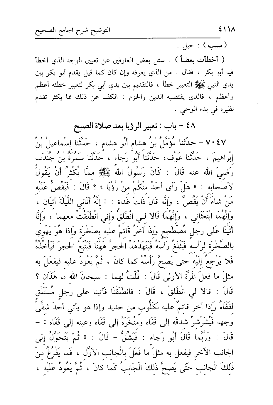 7047 - حَدَّثَنِي مُؤَمَّلُ بْنُ هِشَامٍ أَبُو هِشَامٍ، حَدَّثَنَا إِسْمَاعِيلُ بْنُ إِبْرَاهِيمَ، حَدَّثَنَا عَوْفٌ، حَدَّثَنَا أَبُو رَجَاءٍ، حَدَّثَنَا سَمُرَةُ بْنُ جُنْدُبٍ رَضِيَ اللَّهُ عَنْهُ، قَالَ: كَانَ رَسُولُ اللَّهِ صَلَّى اللهُ عَلَيْهِ وَسَلَّمَ مِمَّا يُكْثِرُ أَنْ يَقُولَ لِأَصْحَابِهِ: «هَلْ رَأَى أَحَدٌ مِنْكُمْ مِنْ رُؤْيَا» قَالَ: فَيَقُصُّ عَلَيْهِ مَنْ شَاءَ اللَّهُ أَنْ يَقُصَّ، وَإِنَّهُ قَالَ ذَاتَ غَدَاةٍ: «إِنَّهُ أَتَانِي اللَّيْلَةَ آتِيَانِ، وَإِنَّهُمَا ابْتَعَثَانِي، وَإِنَّهُمَا قَالاَ لِي انْطَلِقْ، وَإِنِّي انْطَلَقْتُ مَعَهُمَا، وَإِنَّا أَتَيْنَا عَلَى رَجُلٍ مُضْطَجِعٍ، وَإِذَا آخَرُ قَائِمٌ عَلَيْهِ بِصَخْرَةٍ، وَإِذَا هُوَ يَهْوِي بِالصَّخْرَةِ لِرَأْسِهِ فَيَثْلَغُ رَأْسَهُ، فَيَتَدَهْدَهُ الحَجَرُ هَا هُنَا، فَيَتْبَعُ الحَجَرَ فَيَأْخُذُهُ، فَلاَ يَرْجِعُ إِلَيْهِ حَتَّى يَصِحَّ رَأْسُهُ كَمَا كَانَ، ثُمَّ يَعُودُ عَلَيْهِ فَيَفْعَلُ بِهِ مِثْلَ مَا فَعَلَ المَرَّةَ الأُولَى» قَالَ: " قُلْتُ لَهُمَا: سُبْحَانَ اللَّهِ مَا هَذَانِ؟ " قَالَ: " قَالاَ لِي: انْطَلِقِ انْطَلِقْ " قَالَ: " فَانْطَلَقْنَا، فَأَتَيْنَا عَلَى رَجُلٍ مُسْتَلْقٍ لِقَفَاهُ، وَإِذَا آخَرُ قَائِمٌ عَلَيْهِ بِكَلُّوبٍ مِنْ حَدِيدٍ، وَإِذَا هُوَ يَأْتِي أَحَدَ شِقَّيْ وَجْهِهِ فَيُشَرْشِرُ شِدْقَهُ إِلَى قَفَاهُ، وَمَنْخِرَهُ إِلَى قَفَاهُ، وَعَيْنَهُ إِلَى قَفَاهُ، - قَالَ: وَرُبَّمَا قَالَ أَبُو رَجَاءٍ: فَيَشُقُّ - " قَالَ: «ثُمَّ يَتَحَوَّلُ إِلَى الجَانِبِ الآخَرِ فَيَفْعَلُ بِهِ مِثْلَ مَا فَعَلَ بِالْجَانِبِ الأَوَّلِ، فَمَا يَفْرُغُ مِنْ ذَلِكَ الجَانِبِ حَتَّى يَصِحَّ ذَلِكَ الجَانِبُ كَمَا كَانَ، ثُمَّ يَعُودُ عَلَيْهِ