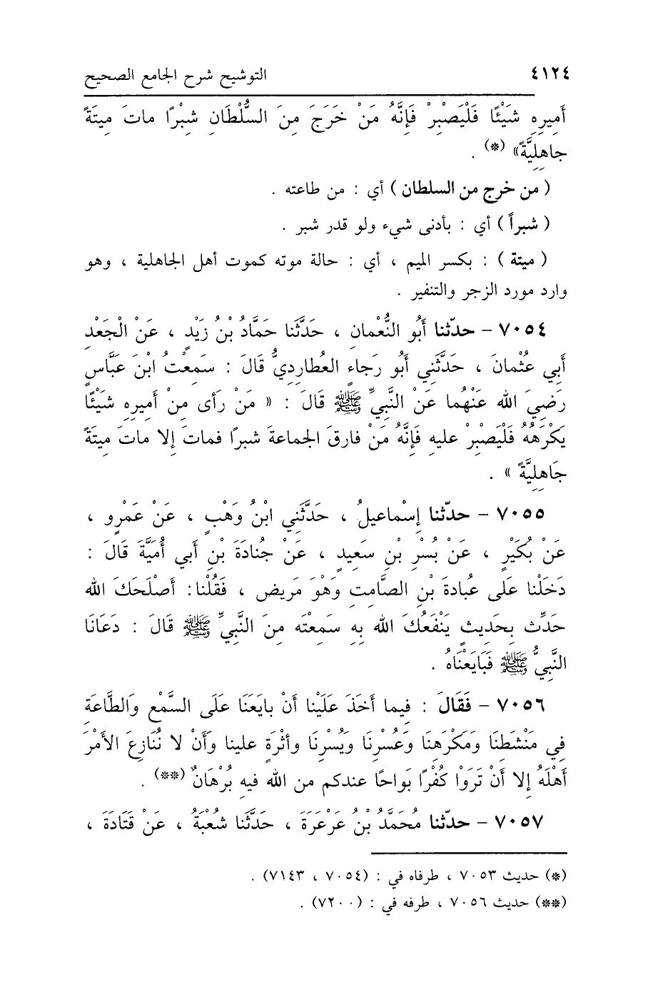 7054 - حَدَّثَنَا أَبُو النُّعْمَانِ، حَدَّثَنَا حَمَّادُ بْنُ زَيْدٍ، عَنِ الجَعْدِ أَبِي عُثْمَانَ، حَدَّثَنِي أَبُو رَجَاءٍ العُطَارِدِيُّ، قَالَ: سَمِعْتُ ابْنَ عَبَّاسٍ، رَضِيَ اللَّهُ عَنْهُمَا، عَنِ النَّبِيِّ صَلَّى اللهُ عَلَيْهِ وَسَلَّمَ، قَالَ: «مَنْ رَأَى مِنْ أَمِيرِهِ شَيْئًا يَكْرَهُهُ فَلْيَصْبِرْ عَلَيْهِ فَإِنَّهُ مَنْ فَارَقَ الجَمَاعَةَ شِبْرًا فَمَاتَ، إِلَّا مَاتَ مِيتَةً جَاهِلِيَّةً».