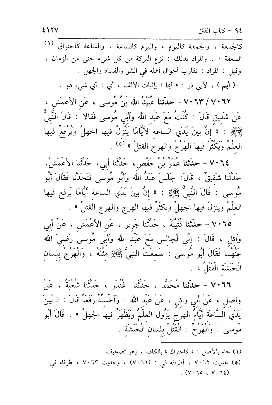 7062، 7063 - حَدَّثَنَا مُسَدَّدٌ، حَدَّثَنَا عُبَيْدُ اللَّهِ بْنُ مُوسَى، عَنِ الأَعْمَشِ، عَنْ شَقِيقٍ، قَالَ: كُنْتُ مَعَ عَبْدِ اللَّهِ، وَأَبِي مُوسَى، فَقَالاَ: قَالَ النَّبِيُّ صَلَّى اللهُ عَلَيْهِ وَسَلَّمَ: «إِنَّ بَيْنَ يَدَيِ السَّاعَةِ لَأَيَّامًا، يَنْزِلُ فِيهَا الجَهْلُ، وَيُرْفَعُ فِيهَا العِلْمُ، وَيَكْثُرُ فِيهَا الهَرْجُ» وَالهَرْجُ: القَتْلُ.