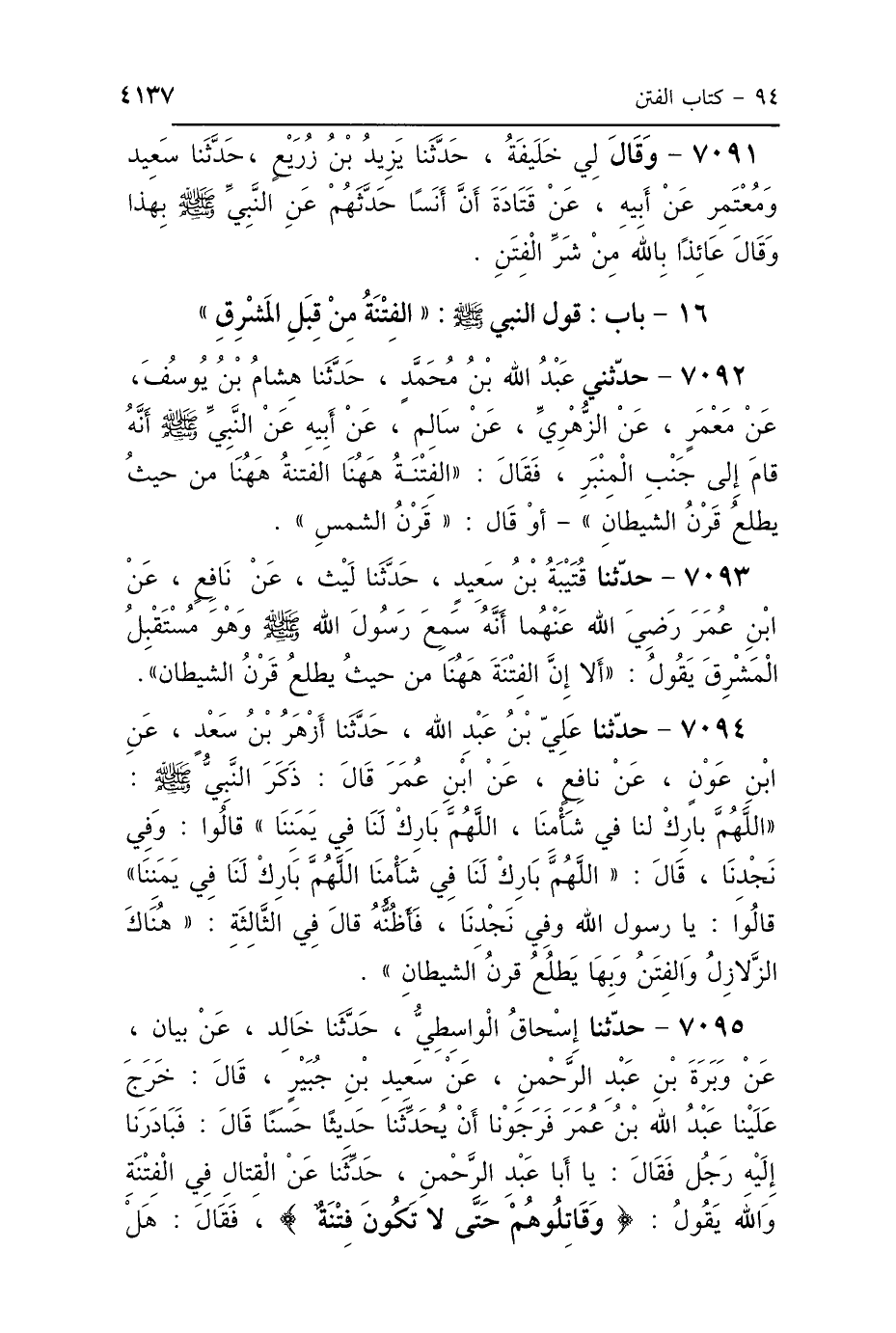 7094 - حَدَّثَنَا عَلِيُّ بْنُ عَبْدِ اللَّهِ، حَدَّثَنَا أَزْهَرُ بْنُ سَعْدٍ، عَنِ ابْنِ عَوْنٍ، عَنْ نَافِعٍ، عَنِ ابْنِ عُمَرَ، قَالَ: ذَكَرَ النَّبِيُّ صَلَّى اللهُ عَلَيْهِ وَسَلَّمَ: «اللَّهُمَّ بَارِكْ لَنَا فِي شَأْمِنَا، اللَّهُمَّ بَارِكْ لَنَا فِي يَمَنِنَا» قَالُوا: يَا رَسُولَ اللَّهِ، وَفِي نَجْدِنَا؟ قَالَ: «اللَّهُمَّ بَارِكْ لَنَا فِي شَأْمِنَا، اللَّهُمَّ بَارِكْ لَنَا فِي يَمَنِنَا» قَالُوا: يَا رَسُولَ اللَّهِ، وَفِي نَجْدِنَا؟ فَأَظُنُّهُ قَالَ فِي الثَّالِثَةِ: «هُنَاكَ الزَّلاَزِلُ وَالفِتَنُ، وَبِهَا يَطْلُعُ قَرْنُ الشَّيْطَانِ».