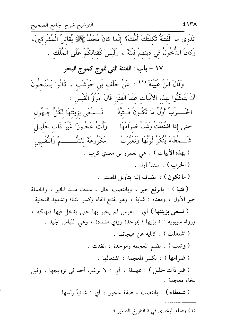 وَقَالَ ابْنُ عُيَيْنَةَ: عَنْ خَلَفِ بْنِ حَوْشَبٍ: كَانُوا يَسْتَحِبُّونَ أَنْ يَتَمَثَّلُوا بِهَذِهِ الأَبْيَاتِ عِنْدَ الفِتَنِ، قَالَ امْرُؤُ القَيْسِ: