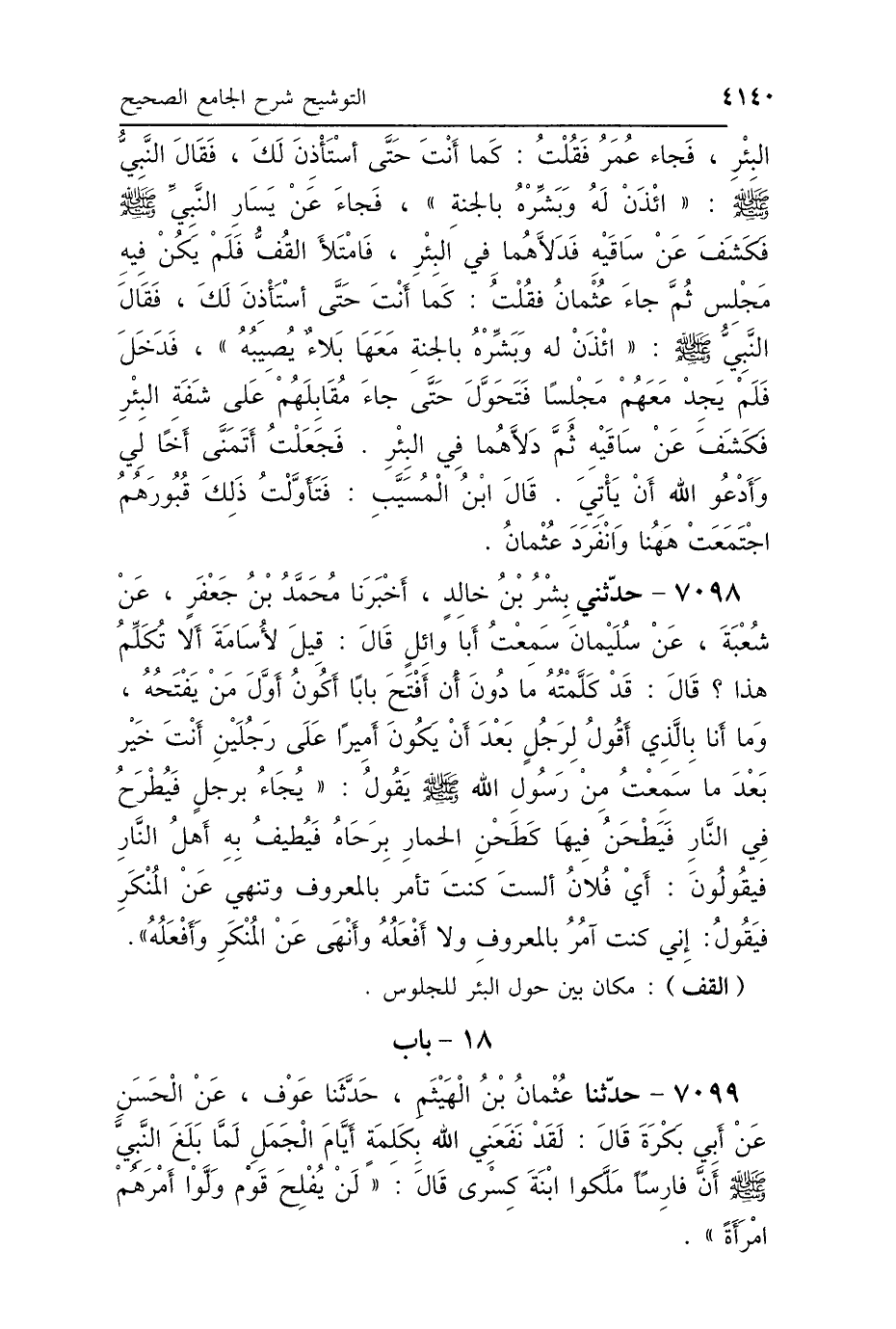البِئْرِ، فَجَاءَ عُمَرُ فَقُلْتُ: كَمَا أَنْتَ حَتَّى أَسْتَأْذِنَ لَكَ، فَقَالَ النَّبِيُّ صَلَّى اللهُ عَلَيْهِ وَسَلَّمَ: «ائْذَنْ لَهُ وَبَشِّرْهُ بِالْجَنَّةِ» فَجَاءَ عَنْ يَسَارِ النَّبِيِّ صَلَّى اللهُ عَلَيْهِ وَسَلَّمَ، فَكَشَفَ عَنْ سَاقَيْهِ فَدَلَّاهُمَا فِي البِئْرِ، فَامْتَلَأَ القُفُّ، فَلَمْ يَكُنْ فِيهِ مَجْلِسٌ، ثُمَّ جَاءَ عُثْمَانُ فَقُلْتُ: كَمَا أَنْتَ حَتَّى أَسْتَأْذِنَ لَكَ، فَقَالَ النَّبِيُّ صَلَّى اللهُ عَلَيْهِ وَسَلَّمَ: «ائْذَنْ لَهُ وَبَشِّرْهُ بِالْجَنَّةِ، مَعَهَا بَلاَءٌ يُصِيبُهُ» فَدَخَلَ فَلَمْ يَجِدْ مَعَهُمْ مَجْلِسًا، فَتَحَوَّلَ حَتَّى جَاءَ مُقَابِلَهُمْ عَلَى شَفَةِ البِئْرِ، فَكَشَفَ عَنْ سَاقَيْهِ ثُمَّ دَلَّاهُمَا فِي البِئْرِ، فَجَعَلْتُ أَتَمَنَّى أَخًا لِي، وَأَدْعُو اللَّهَ أَنْ يَأْتِيَ قَالَ ابْنُ المُسَيِّبِ: «فَتَأَوَّلْتُ ذَلِكَ قُبُورَهُمْ، اجْتَمَعَتْ هَا هُنَا، وَانْفَرَدَ عُثْمَانُ».