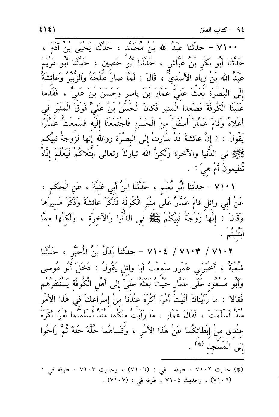 7102، 7103، 7104 - حَدَّثَنَا بَدَلُ بْنُ المُحَبَّرِ، حَدَّثَنَا شُعْبَةُ، أَخْبَرَنِي عَمْرٌو، سَمِعْتُ أَبَا وَائِلٍ، يَقُولُ: دَخَلَ أَبُو مُوسَى وَأَبُو مَسْعُودٍ عَلَى عَمَّارٍ، حَيْثُ بَعَثَهُ عَلِيٌّ إِلَى أَهْلِ الكُوفَةِ يَسْتَنْفِرُهُمْ، فَقَالاَ: مَا رَأَيْنَاكَ أَتَيْتَ أَمْرًا أَكْرَهَ عِنْدَنَا مِنْ إِسْرَاعِكَ فِي هَذَا الأَمْرِ مُنْذُ أَسْلَمْتَ؟ فَقَالَ عَمَّارٌ: «مَا رَأَيْتُ مِنْكُمَا مُنْذُ أَسْلَمْتُمَا أَمْرًا أَكْرَهَ عِنْدِي مِنْ إِبْطَائِكُمَا عَنْ هَذَا الأَمْرِ» وَكَسَاهُمَا حُلَّةً حُلَّةً، ثُمَّ رَاحُوا إِلَى المَسْجِدِ.