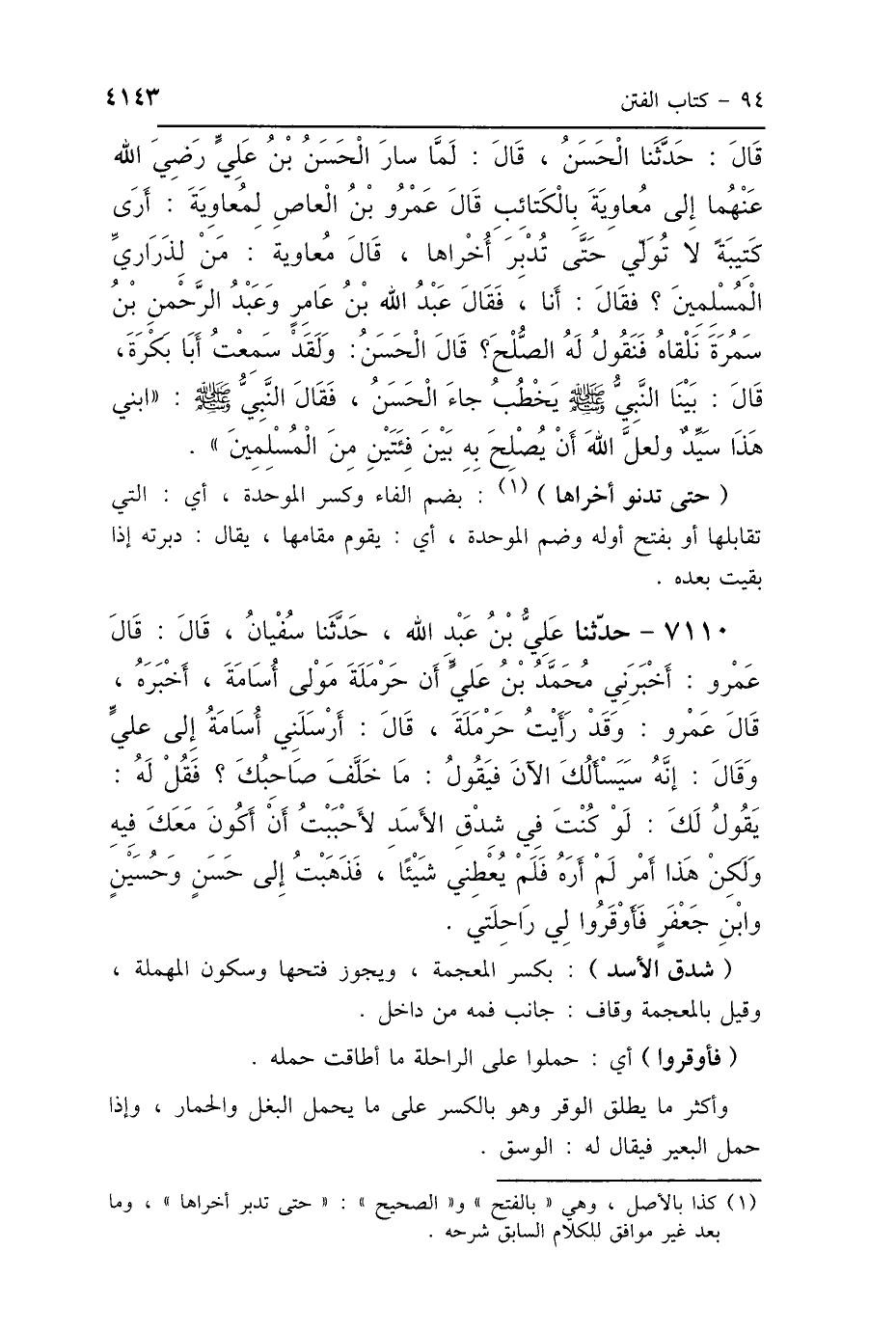 7110 - حَدَّثَنَا عَلِيُّ بْنُ عَبْدِ اللَّهِ، حَدَّثَنَا سُفْيَانُ، قَالَ: قَالَ عَمْرٌو: أَخْبَرَنِي مُحَمَّدُ بْنُ عَلِيٍّ، أَنَّ حَرْمَلَةَ، مَوْلَى أُسَامَةَ أَخْبَرَهُ - قَالَ عَمْرٌو: قَدْ رَأَيْتُ حَرْمَلَةَ - قَالَ: أَرْسَلَنِي أُسَامَةُ إِلَى عَلِيٍّ وَقَالَ: إِنَّهُ سَيَسْأَلُكَ الآنَ فَيَقُولُ: مَا خَلَّفَ صَاحِبَكَ؟ فَقُلْ لَهُ: يَقُولُ لَكَ: «لَوْ كُنْتَ فِي شِدْقِ الأَسَدِ لَأَحْبَبْتُ أَنْ أَكُونَ مَعَكَ فِيهِ، وَلَكِنَّ هَذَا أَمْرٌ لَمْ أَرَهُ» فَلَمْ يُعْطِنِي شَيْئًا فَذَهَبْتُ إِلَى حَسَنٍ وَحُسَيْنٍ وَابْنِ جَعْفَرٍ، فَأَوْقَرُئوا لِي رَاحِلَتِي.