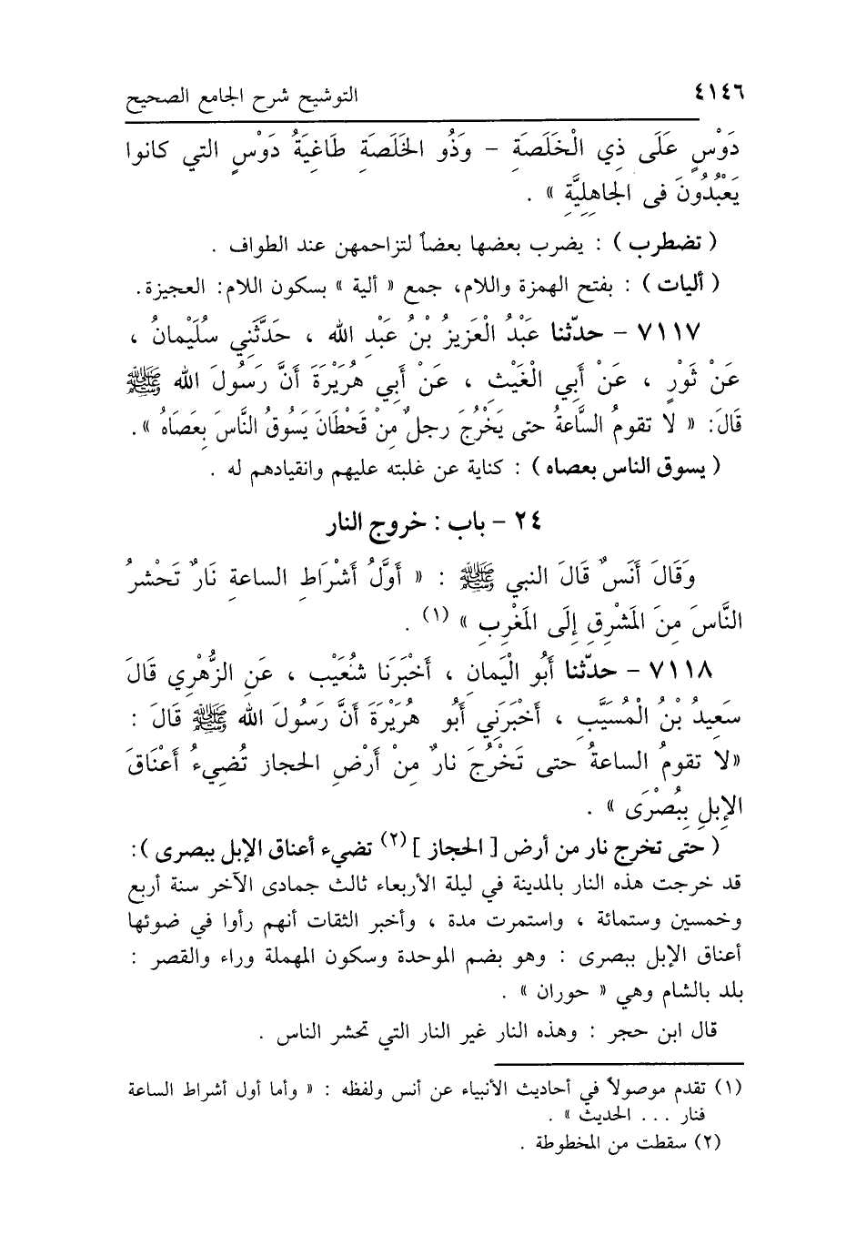 (حتَّى تخرج نار من أرض [الحجاز] تضيء أعناق الإبل ببصرى): قد خرجت هذه النَّار بالمدينة في ليلة الأربعاء ثالث جمادى الآخر سنة أربع وخمسين وستمائة، واستمرت مدة، وأخبر الثقات أنهم رأوا في ضوئها أعناق الإبل ببصرى: وهو بضم الموحدة وسكون المهملة وراء والقصر: بلد بالشام وهي "حوران".