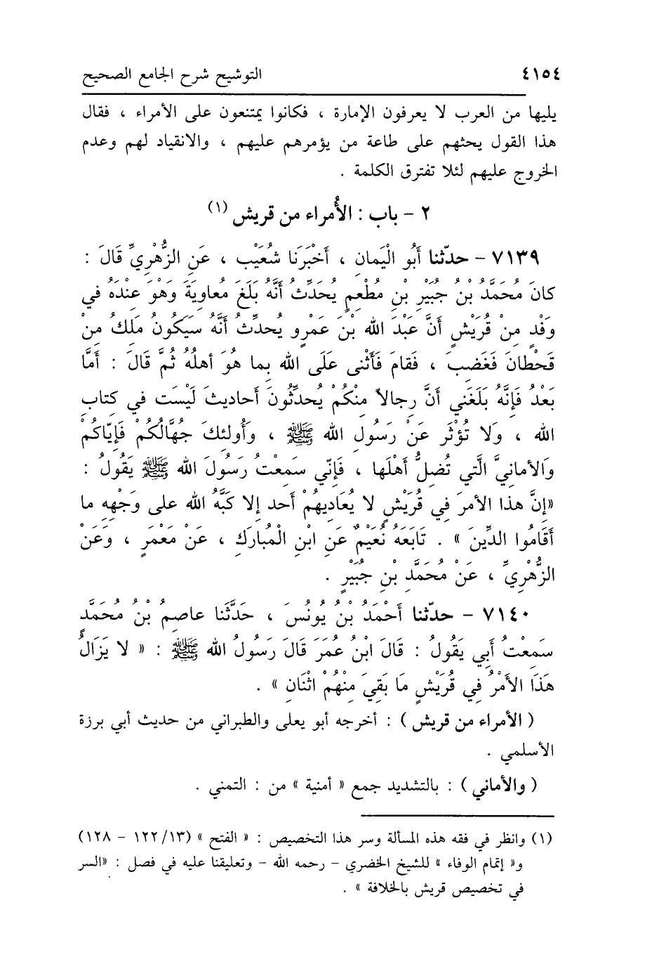 7139 - حَدَّثَنَا أَبُو اليَمَانِ، أَخْبَرَنَا شُعَيْبٌ، عَنِ الزُّهْرِيِّ، قَالَ: كَانَ مُحَمَّدُ بْنُ جُبَيْرِ بْنِ مُطْعِمٍ، يُحَدِّثُ: أَنَّهُ بَلَغَ مُعَاوِيَةَ، وَهُوَ عِنْدَهُ فِي وَفْدٍ مِنْ قُرَيْشٍ: أَنَّ عَبْدَ اللَّهِ بْنَ عَمْرٍو، يُحَدِّثُ: أَنَّهُ سَيَكُونُ مَلِكٌ مِنْ قَحْطَانَ، فَغَضِبَ، فَقَامَ فَأَثْنَى عَلَى اللَّهِ بِمَا هُوَ أَهْلُهُ، ثُمَّ قَالَ: أَمَّا بَعْدُ، فَإِنَّهُ بَلَغَنِي أَنَّ رِجَالًا مِنْكُمْ يُحَدِّثُونَ أَحَادِيثَ لَيْسَتْ فِي كِتَابِ اللَّهِ، وَلاَ تُوثَرُ عَنْ رَسُولِ اللَّهِ صَلَّى اللهُ عَلَيْهِ وَسَلَّمَ، وَأُولَئِكَ جُهَّالُكُمْ، فَإِيَّاكُمْ وَالأَمَانِيَّ الَّتِي تُضِلُّ أَهْلَهَا، فَإِنِّي سَمِعْتُ رَسُولَ اللَّهِ صَلَّى اللهُ عَلَيْهِ وَسَلَّمَ يَقُولُ: «إِنَّ هَذَا الأَمْرَ فِي قُرَيْشٍ، لاَ يُعَادِيهِمْ أَحَدٌ إِلَّا كَبَّهُ اللَّهُ فِي النَّارِ عَلَى وَجْهِهِ، مَا أَقَامُوا الدِّينَ» تَابَعَهُ نُعَيْمٌ، عَنْ ابْنِ المُبَارَكِ، عَنْ مَعْمَرٍ، عَنِ الزُّهْرِيِّ، عَنْ مُحَمَّدِ بْنِ جُبَيْرٍ.