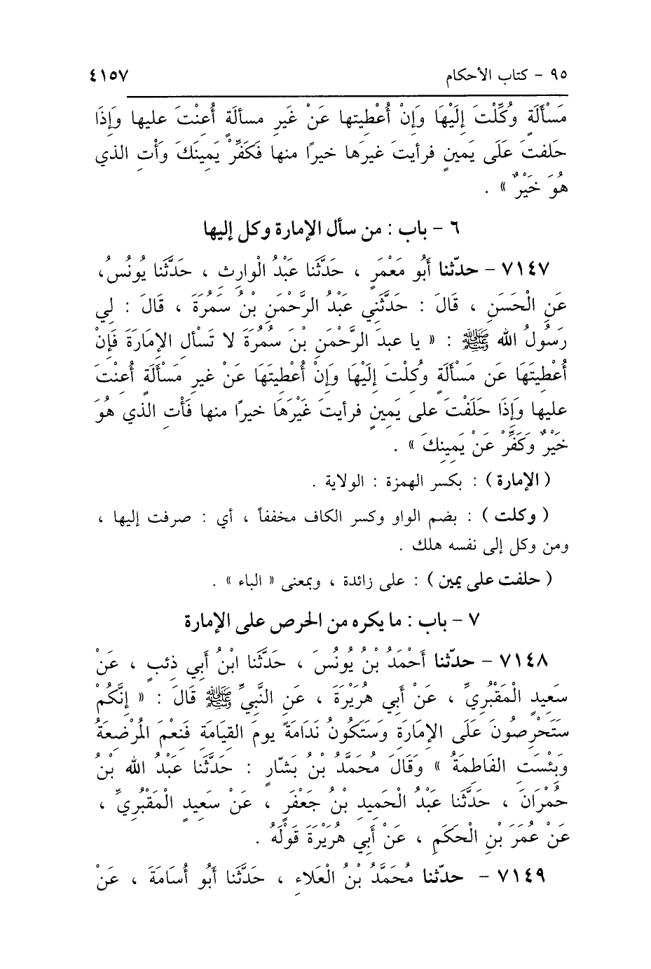 7147 - حَدَّثَنَا أَبُو مَعْمَرٍ، حَدَّثَنَا عَبْدُ الوَارِثِ، حَدَّثَنَا يُونُسُ، عَنِ الحَسَنِ، قَالَ: حَدَّثَنِي عَبْدُ الرَّحْمَنِ بْنُ سَمُرَةَ، قَالَ: قَالَ لِي رَسُولُ اللَّهِ صَلَّى اللهُ عَلَيْهِ وَسَلَّمَ: «يَا عَبْدَ الرَّحْمَنِ بْنَ سَمُرَةَ لاَ تَسْأَلِ الإِمَارَةَ، فَإِنْ أُعْطِيتَهَا عَنْ مَسْأَلَةٍ وُكِلْتَ إِلَيْهَا، وَإِنْ أُعْطِيتَهَا عَنْ غَيْرِ مَسْأَلَةٍ أُعِنْتَ عَلَيْهَا، وَإِذَا حَلَفْتَ عَلَى يَمِينٍ فَرَأَيْتَ غَيْرَهَا خَيْرًا مِنْهَا، فَأْتِ الَّذِي هُوَ خَيْرٌ، وَكَفِّرْ عَنْ يَمِينِكَ».