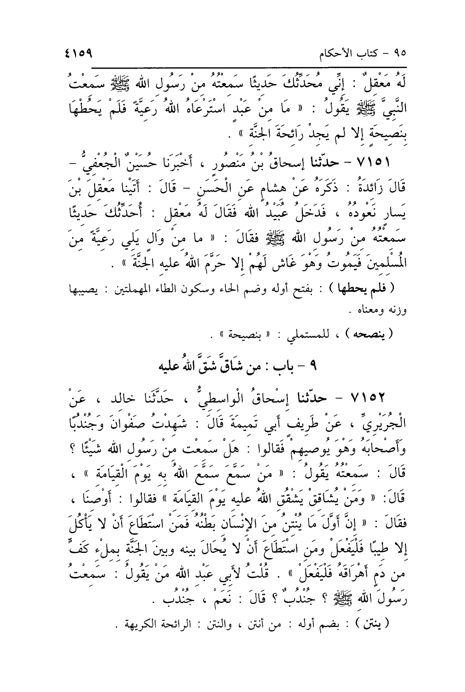 7151 - حَدَّثَنَا إِسْحَاقُ بْنُ مَنْصُورٍ، أَخْبَرَنَا حُسَيْنٌ الجُعْفِيُّ، قَالَ: زَائِدَةُ ذَكَرَهُ: عَنْ هِشَامٍ، عَنِ الحَسَنِ، قَالَ: أَتَيْنَا مَعْقِلَ بْنَ يَسَارٍ نَعُودُهُ، فَدَخَلَ عَلَيْنَا عُبَيْدُ اللَّهِ، فَقَالَ لَهُ مَعْقِلٌ: أُحَدِّثُكَ حَدِيثًا سَمِعْتُهُ مِنْ رَسُولِ اللَّهِ صَلَّى اللهُ عَلَيْهِ وَسَلَّمَ، فَقَالَ: «مَا مِنْ وَالٍ يَلِي رَعِيَّةً مِنَ المُسْلِمِينَ، فَيَمُوتُ وَهُوَ غَاشٌّ لَهُمْ، إِلَّا حَرَّمَ اللَّهُ عَلَيْهِ الجَنَّةَ».