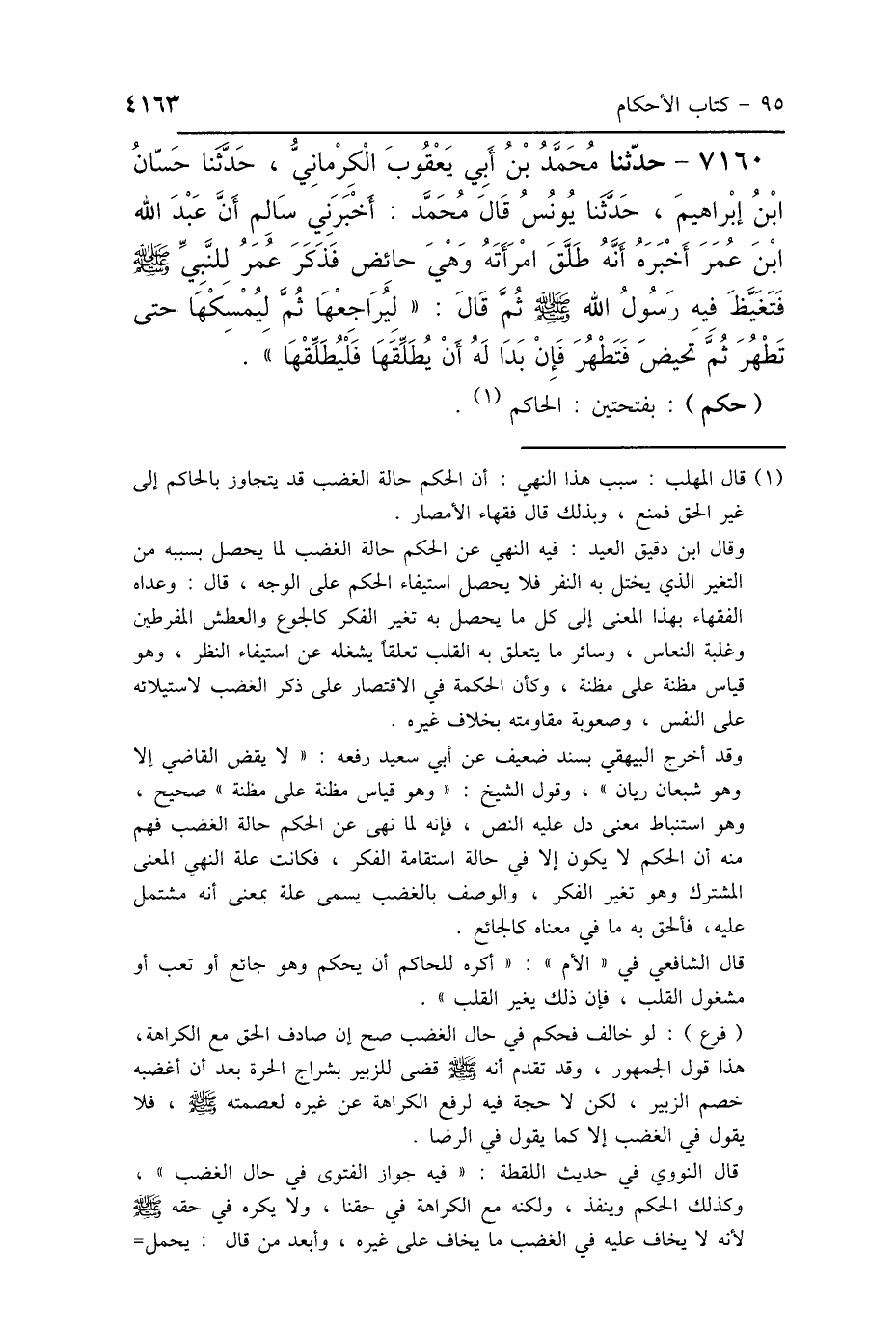7160 - حَدَّثَنَا مُحَمَّدُ بْنُ أَبِي يَعْقُوبَ الكَرْمَانِيُّ، حَدَّثَنَا حَسَّانُ بْنُ إِبْرَاهِيمَ، حَدَّثَنَا يُونُسُ، قَالَ: حَدَّثَنَا مُحَمَّدٌ هُوَ الزُّهْرِيُّ، أَخْبَرَنِي سَالِمٌ، أَنَّ عَبْدَ اللَّهِ بْنَ عُمَرَ، أَخْبَرَهُ أَنَّهُ طَلَّقَ امْرَأَتَهُ وَهِيَ حَائِضٌ، فَذَكَرَ عُمَرُ لِلنَّبِيِّ صَلَّى اللهُ عَلَيْهِ وَسَلَّمَ فَتَغَيَّظَ عَلَيْهِ رَسُولُ اللَّهِ صَلَّى اللهُ عَلَيْهِ وَسَلَّمَ، ثُمَّ قَالَ: «لِيُرَاجِعْهَا، ثُمَّ لِيُمْسِكْهَا حَتَّى تَطْهُرَ، ثُمَّ تَحِيضَ فَتَطْهُرَ، فَإِنْ بَدَا لَهُ أَنْ يُطَلِّقَهَا فَلْيُطَلِّقْهَا».