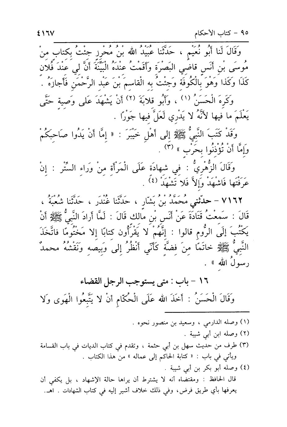 وَقَالَ لَنَا أَبُو نُعَيْمٍ، حَدَّثَنَا عُبَيْدُ اللَّهِ بْنُ مُحْرِزٍ: جِئْتُ بِكِتَابٍ مِنْ مُوسَى بْنِ أَنَسٍ قَاضِي البَصْرَةِ، وَأَقَمْتُ عِنْدَهُ البَيِّنَةَ: أَنَّ لِي عِنْدَ فُلاَنٍ كَذَا وَكَذَا، وَهُوَ بِالكُوفَةِ، وَجِئْتُ بِهِ القَاسِمَ بْنَ عَبْدِ الرَّحْمَنِ فَأَجَازَهُ وَكَرِهَ الحَسَنُ، وَأَبُو قِلاَبَةَ: أَنْ يَشْهَدَ عَلَى وَصِيَّةٍ حَتَّى يَعْلَمَ مَا فِيهَا، لِأَنَّهُ لاَ يَدْرِي لَعَلَّ فِيهَا جَوْرًا وَقَدْ كَتَبَ النَّبِيُّ صَلَّى اللهُ عَلَيْهِ وَسَلَّمَ إِلَى أَهْلِ خَيْبَرَ: «إِمَّا أَنْ تَدُوا صَاحِبَكُمْ، وَإِمَّا أَنْ تُؤْذِنُوا بِحَرْبٍ» وَقَالَ الزُّهْرِيُّ، فِي الشَّهَادَةِ عَلَى المَرْأَةِ مِنْ وَرَاءِ السِّتْرِ: «إِنْ عَرَفْتَهَا فَاشْهَدْ، وَإِلَّا فَلاَ تَشْهَدْ».