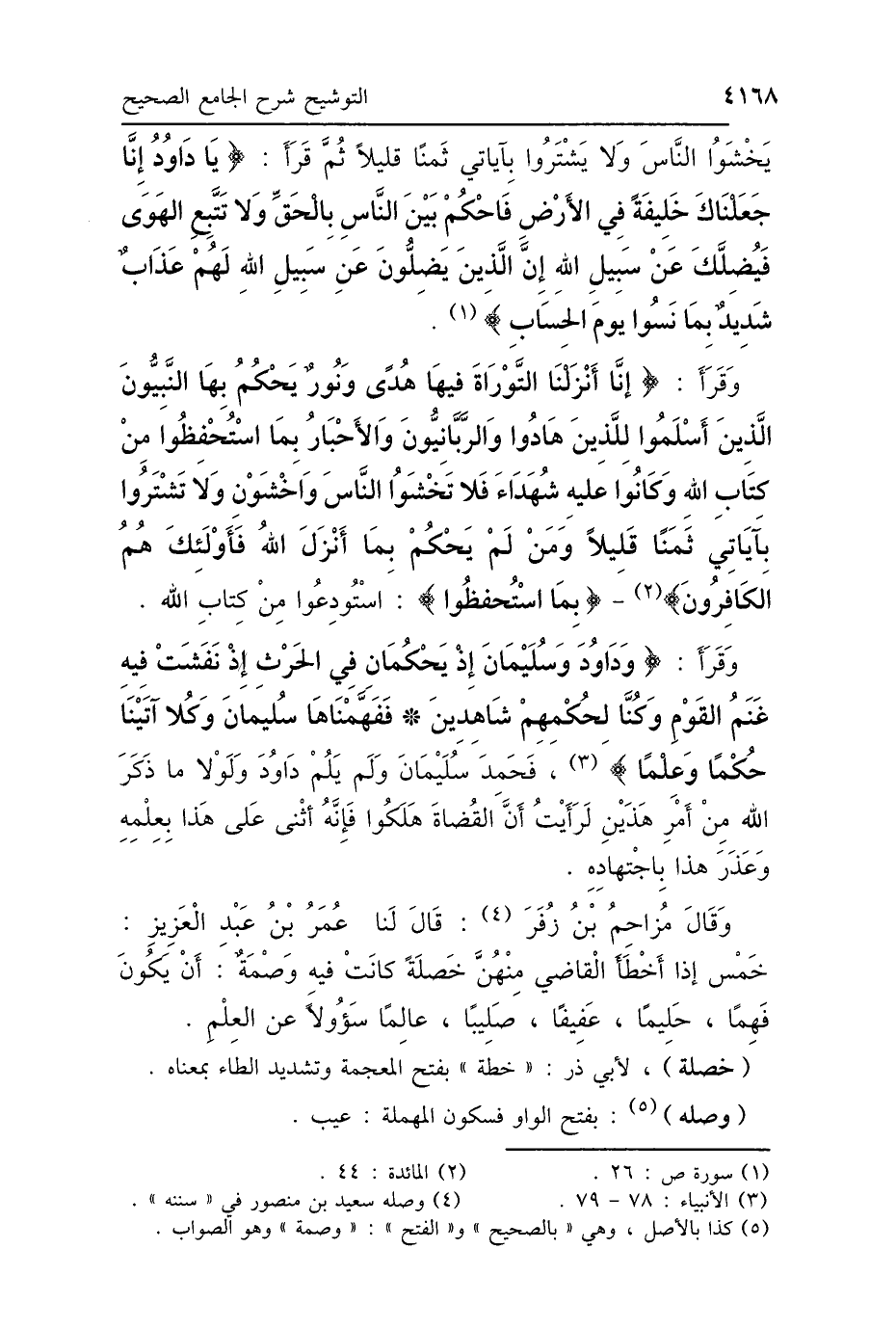 يَخْشَوُا النَّاسَ، وَلاَ يَشْتَرُوا بِآيَاتِي ثَمَنًا قَلِيلًا، ثُمَّ قَرَأَ: {يَا دَاوُدُ إِنَّا جَعَلْنَاكَ خَلِيفَةً فِي الأَرْضِ، فَاحْكُمْ بَيْنَ النَّاسِ بِالحَقِّ، وَلاَ تَتَّبِعِ الهَوَى فَيُضِلَّكَ عَنْ سَبِيلِ اللَّهِ، إِنَّ الَّذِينَ يَضِلُّونَ عَنْ سَبِيلِ اللَّهِ لَهُمْ عَذَابٌ شَدِيدٌ بِمَا نَسُوا يَوْمَ الحِسَابِ}، وَقَرَأَ: {إِنَّا أَنْزَلْنَا التَّوْرَاةَ فِيهَا هُدًى وَنُورٌ يَحْكُمُ بِهَا النَّبِيُّونَ الَّذِينَ أَسْلَمُوا لِلَّذِينَ هَادُوا وَالرَّبَّانِيُّونَ وَالأَحْبَارُ بِمَا اسْتُحْفِظُوا مِنْ كِتَابِ اللَّهِ، وَكَانُوا عَلَيْهِ شُهَدَاءَ، فَلاَ تَخْشَوُا النَّاسَ وَاخْشَوْنِ، وَلاَ تَشْتَرُوا بِآيَاتِي ثَمَنًا قَلِيلًا وَمَنْ لَمْ يَحْكُمْ بِمَا أَنْزَلَ اللَّهُ فَأُولَئِكَ هُمُ الكَافِرُونَ} [المائدة: 44]، " {بِمَا اسْتُحْفِظُوا} [المائدة: 44]: اسْتُوْدِعُوا مِنْ كِتَابِ اللَّهِ "، وَقَرَأَ: {وَدَاوُدَ، وَسُلَيْمَانَ إِذْ يَحْكُمَانِ فِي الحَرْثِ إِذْ نَفَشَتْ فِيهِ غَنَمُ القَوْمِ وَكُنَّا لِحُكْمِهِمْ شَاهِدِينَ، فَفَهَّمْنَاهَا سُلَيْمَانَ وَكُلًّا آتَيْنَا حُكْمًا وَعِلْمًا}، «فَحَمِدَ سُلَيْمَانَ وَلَمْ يَلُمْ دَاوُدَ، وَلَوْلاَ مَا ذَكَرَ اللَّهُ مِنْ أَمْرِ هَذَيْنِ لَرَأَيْتُ أَنَّ القُضَاةَ هَلَكُوا، فَإِنَّهُ أَثْنَى عَلَى هَذَا بِعِلْمِهِ وَعَذَرَ هَذَا بِاجْتِهَادِهِ» وَقَالَ مُزَاحِمُ بْنُ زُفَرَ: قَالَ لَنَا عُمَرُ بْنُ عَبْدِ العَزِيزِ: "خَمْسٌ إِذَا أَخْطَأَ القَاضِي مِنْهُنَّ خَصْلَةً، كَانَتْ فِيهِ وَصْمَةٌ: أَنْ يَكُونَ فَهِمًا، حَلِيمًا، عَفِيفًا، صَلِيبًا، عَالِمًا، سَئُولًا عَنِ العِلْمِ".