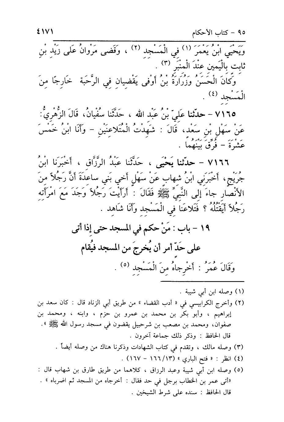 وَيَحْيَى بْنُ يَعْمَرَ فِي المَسْجِدِ وَقَضَى مَرْوَانُ عَلَى زَيْدِ بْنِ ثَابِتٍ بِاليَمِينِ عِنْدَ المِنْبَرِ وَكَانَ الحَسَنُ، وَزُرَارَةُ بْنُ أَوْفَى، يَقْضِيَانِ فِي الرَّحَبَةِ خَارِجًا مِنَ المَسْجِدِ.