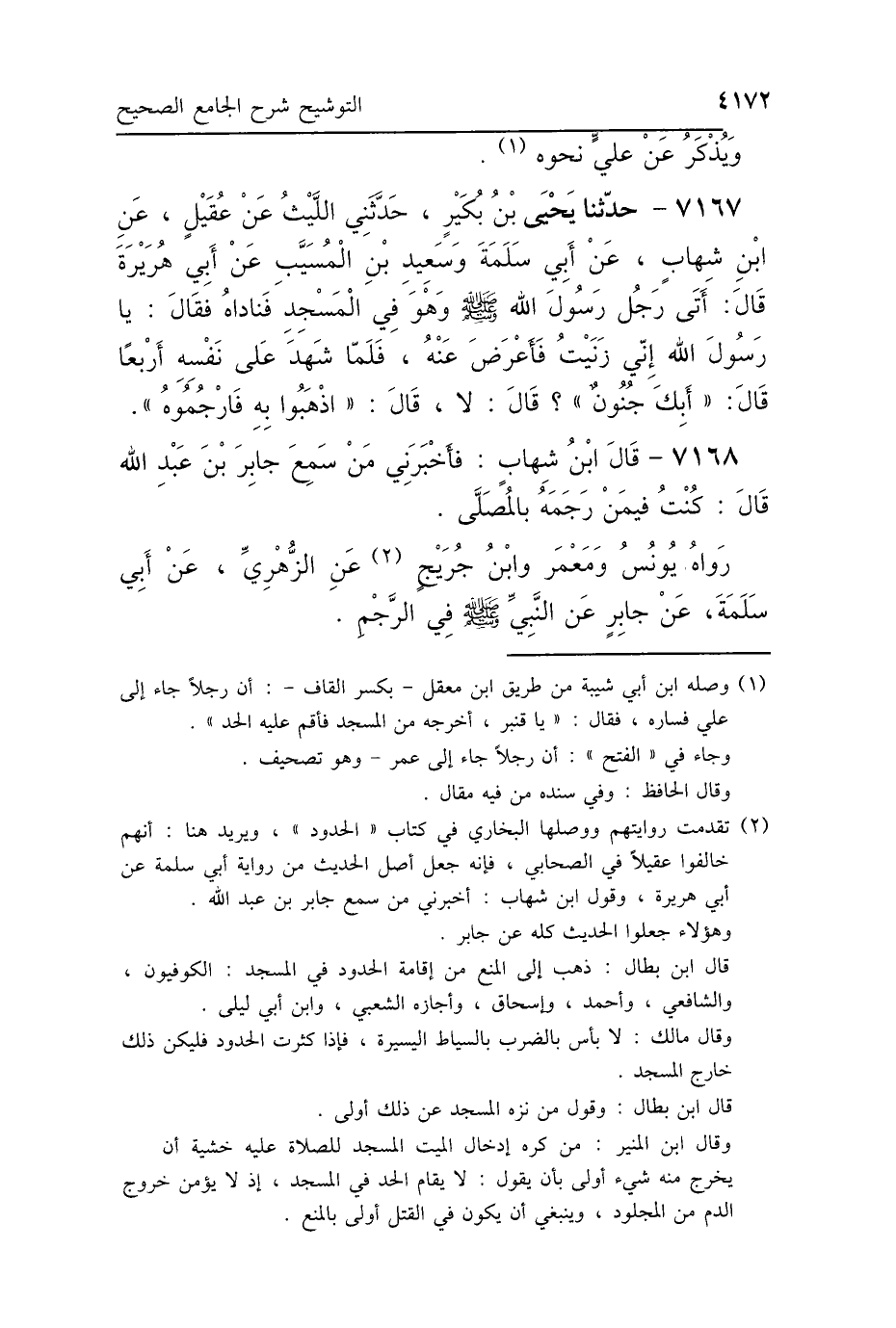 7168 - قَالَ ابْنُ شِهَابٍ: فَأَخْبَرَنِي مَنْ سَمِعَ جَابِرَ بْنَ عَبْدِ اللَّهِ قَالَ: «كُنْتُ فِيمَنْ رَجَمَهُ بِالْمُصَلَّى»، رَوَاهُ يُونُسُ، وَمَعْمَرٌ، وَابْنُ جُرَيْجٍ، عَنِ الزُّهْرِيِّ، عَنْ أَبِي سَلَمَةَ، عَنْ جَابِرٍ عَنِ النَّبِيِّ صَلَّى اللهُ عَلَيْهِ وَسَلَّمَ فِي الرَّجْمِ.