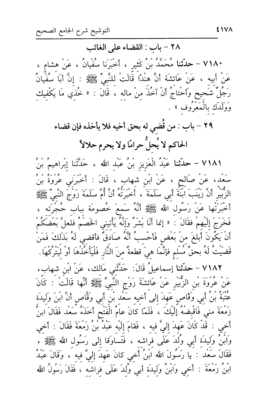 7181 - حَدَّثَنَا عَبْدُ العَزِيزِ بْنُ عَبْدِ اللَّهِ، حَدَّثَنَا إِبْرَاهِيمُ بْنُ سَعْدٍ، عَنْ صَالِحٍ، عَنِ ابْنِ شِهَابٍ، قَالَ: أَخْبَرَنِي عُرْوَةُ بْنُ الزُّبَيْرِ، أَنَّ زَيْنَبَ بِنْتَ أَبِي سَلَمَةَ، أَخْبَرَتْهُ أَنَّ أُمَّ سَلَمَةَ زَوْجَ النَّبِيِّ صَلَّى اللهُ عَلَيْهِ وَسَلَّمَ، أَخْبَرَتْهَا، عَنْ رَسُولِ اللَّهِ صَلَّى اللهُ عَلَيْهِ وَسَلَّمَ، أَنَّهُ سَمِعَ خُصُومَةً بِبَابِ حُجْرَتِهِ فَخَرَجَ إِلَيْهِمْ، فَقَالَ: «إِنَّمَا أَنَا بَشَرٌ، وَإِنَّهُ يَأْتِينِي الخَصْمُ، فَلَعَلَّ بَعْضَكُمْ أَنْ يَكُونَ أَبْلَغَ مِنْ بَعْضٍ، فَأَحْسِبُ أَنَّهُ صَادِقٌ فَأَقْضِي لَهُ بِذَلِكَ، فَمَنْ قَضَيْتُ لَهُ بِحَقِّ مُسْلِمٍ، فَإِنَّمَا هِيَ قِطْعَةٌ مِنَ النَّارِ فَلْيَأْخُذْهَا أَوْ لِيَتْرُكْهَا».
