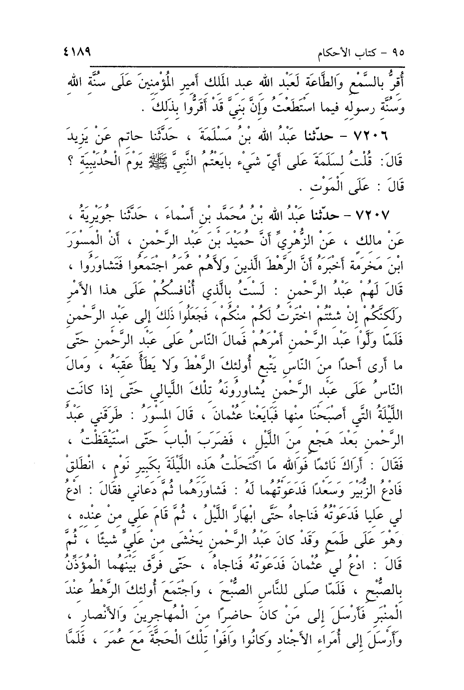 7207 - حَدَّثَنَا عَبْدُ اللَّهِ بْنُ مُحَمَّدِ بْنِ أَسْمَاءَ، حَدَّثَنَا جُوَيْرِيَةُ، عَنْ مَالِكٍ، عَنِ الزُّهْرِيِّ، أَنَّ حُمَيْدَ بْنَ عَبْدِ الرَّحْمَنِ، أَخْبَرَهُ أَنَّ المِسْوَرَ بْنَ مَخْرَمَةَ أَخْبَرَهُ، أَنَّ الرَّهْطَ الَّذِينَ وَلَّاهُمْ عُمَرُ اجْتَمَعُوا فَتَشَاوَرُوا، فَقَالَ لَهُمْ عَبْدُ الرَّحْمَنِ: «لَسْتُ بِالَّذِي أُنَافِسُكُمْ عَلَى هَذَا الأَمْرِ، وَلَكِنَّكُمْ إِنْ شِئْتُمُ اخْتَرْتُ لَكُمْ مِنْكُمْ»، فَجَعَلُوا ذَلِكَ إِلَى عَبْدِ الرَّحْمَنِ، فَلَمَّا وَلَّوْا عَبْدَ الرَّحْمَنِ أَمْرَهُمْ، فَمَالَ النَّاسُ عَلَى عَبْدِ الرَّحْمَنِ، حَتَّى مَا أَرَى أَحَدًا مِنَ النَّاسِ يَتْبَعُ أُولَئِكَ الرَّهْطَ وَلاَ يَطَأُ عَقِبَهُ، وَمَالَ النَّاسُ عَلَى عَبْدِ الرَّحْمَنِ يُشَاوِرُونَهُ تِلْكَ اللَّيَالِي، حَتَّى إِذَا كَانَتِ اللَّيْلَةُ الَّتِي أَصْبَحْنَا مِنْهَا فَبَايَعْنَا عُثْمَانَ، قَالَ المِسْوَرُ: طَرَقَنِي عَبْدُ الرَّحْمَنِ بَعْدَ هَجْعٍ مِنَ اللَّيْلِ، فَضَرَبَ البَابَ حَتَّى اسْتَيْقَظْتُ، فَقَالَ: «أَرَاكَ نَائِمًا فَوَاللَّهِ مَا اكْتَحَلْتُ هَذِهِ اللَّيْلَةَ بِكَبِيرِ نَوْمٍ، انْطَلِقْ فَادْعُ الزُّبَيْرَ وَسَعْدًا»، فَدَعَوْتُهُمَا لَهُ، فَشَاوَرَهُمَا، ثُمَّ دَعَانِي، فَقَالَ: «ادْعُ لِي عَلِيًّا»، فَدَعَوْتُهُ، فَنَاجَاهُ حَتَّى ابْهَارَّ اللَّيْلُ، ثُمَّ قَامَ عَلِيٌّ مِنْ عِنْدِهِ وَهُوَ عَلَى طَمَعٍ، وَقَدْ كَانَ عَبْدُ الرَّحْمَنِ يَخْشَى مِنْ عَلِيٍّ شَيْئًا، ثُمَّ قَالَ: «ادْعُ لِي عُثْمَانَ»، فَدَعَوْتُهُ، فَنَاجَاهُ حَتَّى فَرَّقَ بَيْنَهُمَا المُؤَذِّنُ بِالصُّبْحِ، فَلَمَّا صَلَّى لِلنَّاسِ الصُّبْحَ، وَاجْتَمَعَ أُولَئِكَ الرَّهْطُ عِنْدَ المِنْبَرِ، فَأَرْسَلَ إِلَى مَنْ كَانَ حَاضِرًا مِنَ المُهَاجِرِينَ وَالأَنْصَارِ، وَأَرْسَلَ إِلَى أُمَرَاءِ الأَجْنَادِ، وَكَانُوا وَافَوْا تِلْكَ الحَجَّةَ مَعَ عُمَرَ، فَلَمَّا
