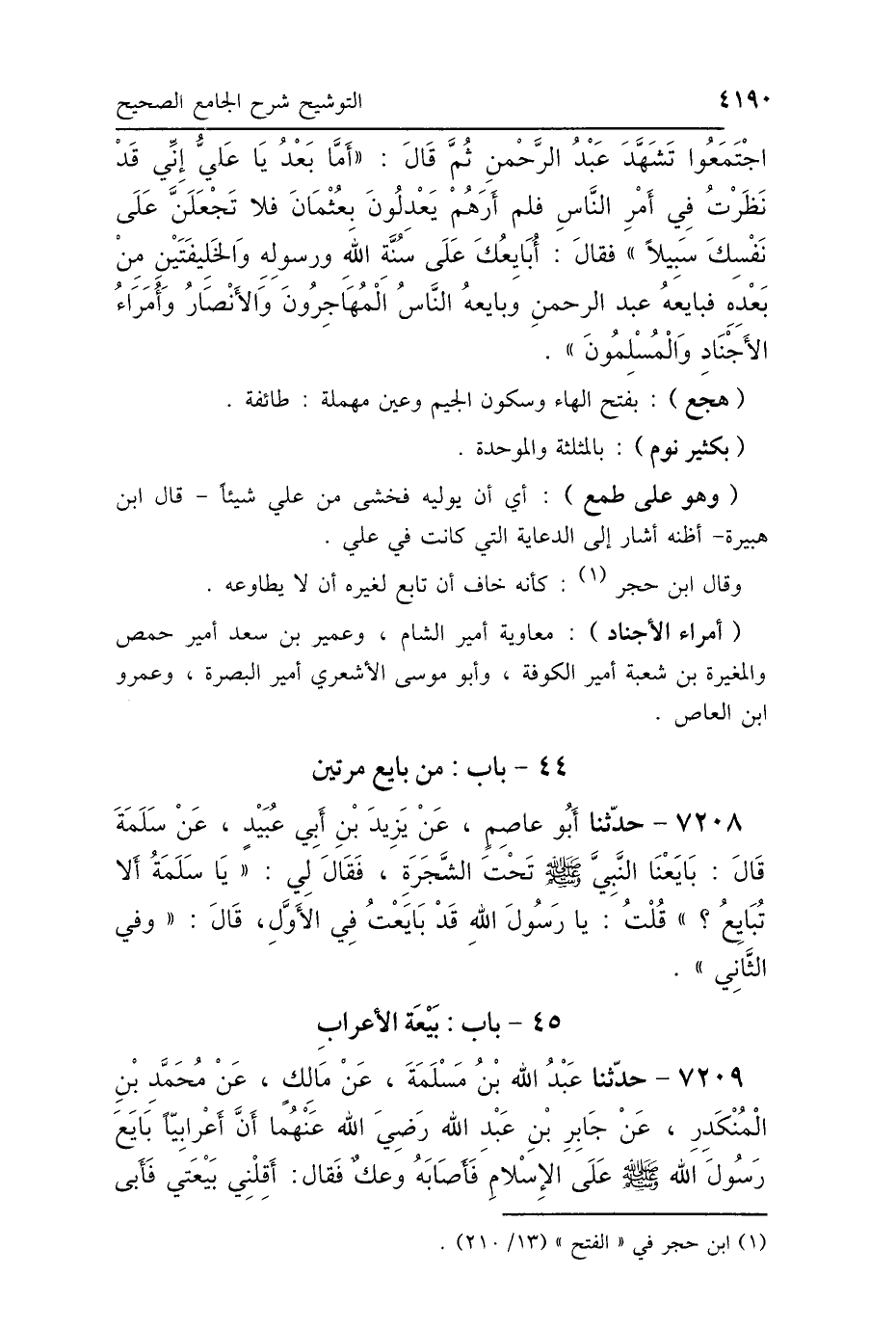 7208 - حَدَّثَنَا أَبُو عَاصِمٍ، عَنْ يَزِيدَ بْنِ أَبِي عُبَيْدٍ، عَنْ سَلَمَةَ، قَالَ: بَايَعْنَا النَّبِيَّ صَلَّى اللهُ عَلَيْهِ وَسَلَّمَ تَحْتَ الشَّجَرَةِ، فَقَالَ لِي: «يَا سَلَمَةُ أَلاَ تُبَايِعُ؟»، قُلْتُ: يَا رَسُولَ اللَّهِ، قَدْ بَايَعْتُ فِي الأَوَّلِ، قَالَ: «وَفِي الثَّانِي».