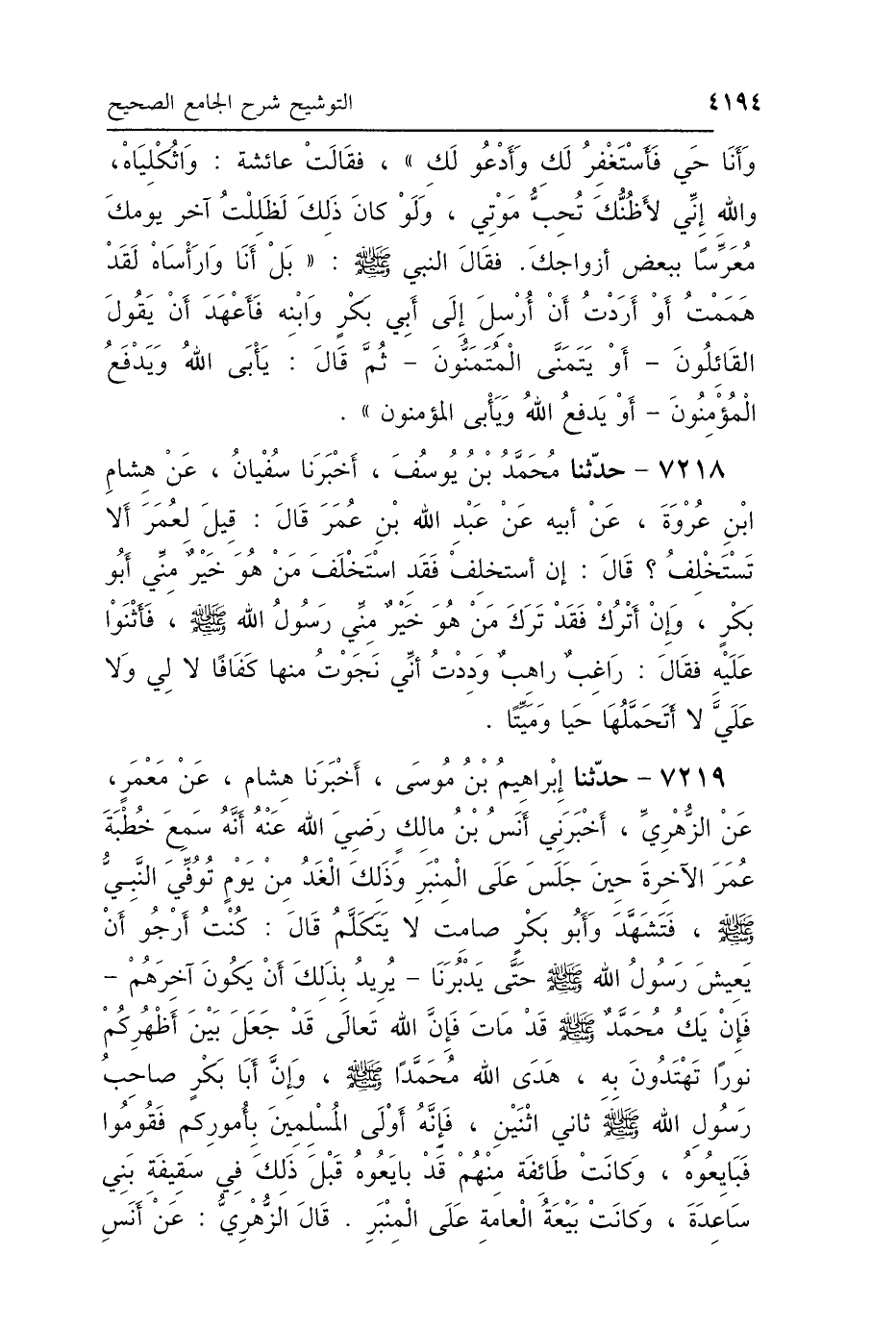 7219 - حَدَّثَنَا إِبْرَاهِيمُ بْنُ مُوسَى، أَخْبَرَنَا هِشَامٌ، عَنْ مَعْمَرٍ، عَنِ الزُّهْرِيِّ، أَخْبَرَنِي أَنَسُ بْنُ مَالِكٍ رَضِيَ اللَّهُ عَنْهُ: أَنَّهُ سَمِعَ خُطْبَةَ عُمَرَ الآخِرَةَ حِينَ جَلَسَ عَلَى المِنْبَرِ، وَذَلِكَ الغَدَ مِنْ يَوْمٍ تُوُفِّيَ النَّبِيُّ صَلَّى اللهُ عَلَيْهِ وَسَلَّمَ، فَتَشَهَّدَ وَأَبُو بَكْرٍ صَامِتٌ لاَ يَتَكَلَّمُ، قَالَ: «كُنْتُ أَرْجُو أَنْ يَعِيشَ رَسُولُ اللَّهِ صَلَّى اللهُ عَلَيْهِ وَسَلَّمَ حَتَّى يَدْبُرَنَا، يُرِيدُ بِذَلِكَ أَنْ يَكُونَ آخِرَهُمْ، فَإِنْ يَكُ مُحَمَّدٌ صَلَّى اللهُ عَلَيْهِ وَسَلَّمَ قَدْ مَاتَ، فَإِنَّ اللَّهَ تَعَالَى قَدْ جَعَلَ بَيْنَ أَظْهُرِكُمْ نُورًا تَهْتَدُونَ بِهِ، هَدَى اللَّهُ مُحَمَّدًا صَلَّى اللهُ عَلَيْهِ وَسَلَّمَ، وَإِنَّ أَبَا بَكْرٍ صَاحِبُ رَسُولِ اللَّهِ صَلَّى اللهُ عَلَيْهِ وَسَلَّمَ، ثَانِيَ اثْنَيْنِ، فَإِنَّهُ أَوْلَى المُسْلِمِينَ بِأُمُورِكُمْ، فَقُومُوا فَبَايِعُوهُ»، وَكَانَتْ طَائِفَةٌ مِنْهُمْ قَدْ بَايَعُوهُ قَبْلَ ذَلِكَ فِي سَقِيفَةِ بَنِي سَاعِدَةَ، وَكَانَتْ بَيْعَةُ العَامَّةِ عَلَى المِنْبَرِ قَالَ الزُّهْرِيُّ: عَنْ أَنَسِ