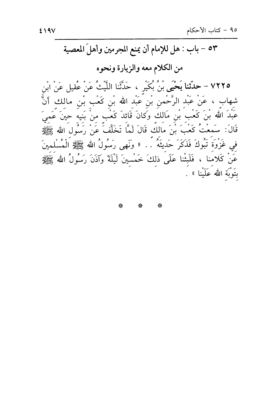 7225 - حَدَّثَنِي يَحْيَى بْنُ بُكَيْرٍ، حَدَّثَنَا اللَّيْثُ، عَنْ عُقَيْلٍ، عَنِ ابْنِ شِهَابٍ، عَنْ عَبْدِ الرَّحْمَنِ بْنِ عَبْدِ اللَّهِ بْنِ كَعْبِ بْنِ مَالِكٍ، أَنَّ عَبْدَ اللَّهِ بْنَ كَعْبِ بْنِ مَالِكٍ، وَكَانَ قَائِدَ كَعْبٍ مِنْ بَنِيهِ حِينَ عَمِيَ، قَالَ: سَمِعْتُ كَعْبَ بْنَ مَالِكٍ قَالَ: لَمَّا تَخَلَّفَ عَنْ رَسُولِ اللَّهِ صَلَّى اللهُ عَلَيْهِ وَسَلَّمَ فِي غَزْوَةِ تَبُوكَ، فَذَكَرَ حَدِيثَهُ، «وَنَهَى رَسُولُ اللَّهِ صَلَّى اللهُ عَلَيْهِ وَسَلَّمَ المُسْلِمِينَ عَنْ كَلاَمِنَا، فَلَبِثْنَا عَلَى ذَلِكَ خَمْسِينَ لَيْلَةً، وَآذَنَ رَسُولُ اللَّهِ صَلَّى اللهُ عَلَيْهِ وَسَلَّمَ بِتَوْبَةِ اللَّهِ عَلَيْنَا».
