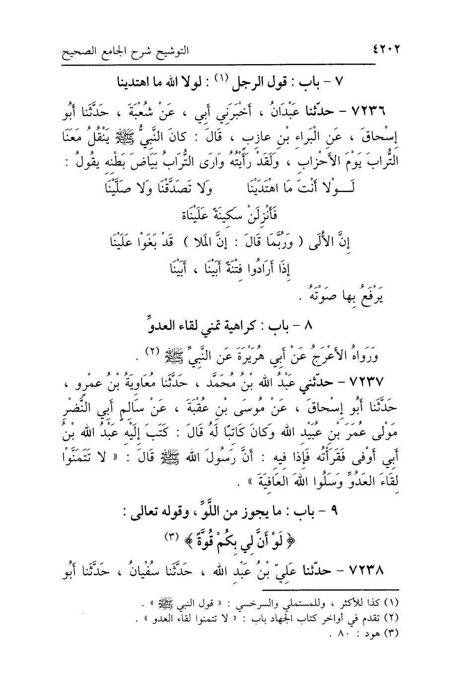 7236 - حَدَّثَنَا عَبْدَانُ، أَخْبَرَنِي أَبِي، عَنْ شُعْبَةَ، حَدَّثَنَا أَبُو إِسْحَاقَ، عَنِ البَرَاءِ بْنِ عَازِبٍ قَالَ: كَانَ النَّبِيُّ صَلَّى اللهُ عَلَيْهِ وَسَلَّمَ يَنْقُلُ مَعَنَا التُّرَابَ يَوْمَ الأَحْزَابِ، وَلَقَدْ رَأَيْتُهُ وَارَى التُّرَابُ بَيَاضَ بَطْنِهِ، يَقُولُ: لَوْلاَ أَنْتَ مَا اهْتَدَيْنَا ... وَلاَ تَصَدَّقْنَا وَلاَ صَلَّيْنَا