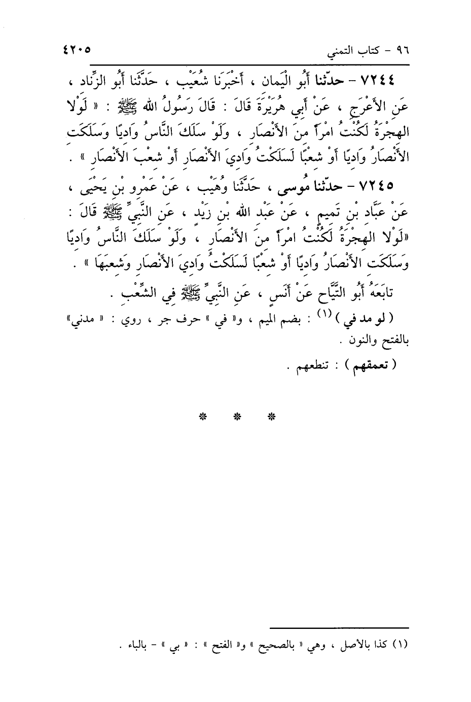 7245 - حَدَّثَنَا مُوسَى، حَدَّثَنَا وُهَيْبٌ، عَنْ عَمْرِو بْنِ يَحْيَى، عَنْ عَبَّادِ بْنِ تَمِيمٍ، عَنْ عَبْدِ اللَّهِ بْنِ زَيْدٍ، عَنِ النَّبِيِّ صَلَّى اللهُ عَلَيْهِ وَسَلَّمَ، قَالَ: «لَوْلاَ الهِجْرَةُ لَكُنْتُ امْرَأً مِنَ الأَنْصَارِ، وَلَوْ سَلَكَ النَّاسُ وَادِيًا أَوْ شِعْبًا لَسَلَكْتُ وَادِيَ الأَنْصَارِ وَشِعْبَهَا» تَابَعَهُ أَبُو التَّيَّاحِ، عَنْ أَنَسٍ، عَنِ النَّبِيِّ صَلَّى اللهُ عَلَيْهِ وَسَلَّمَ: فِي الشِّعْبِ.