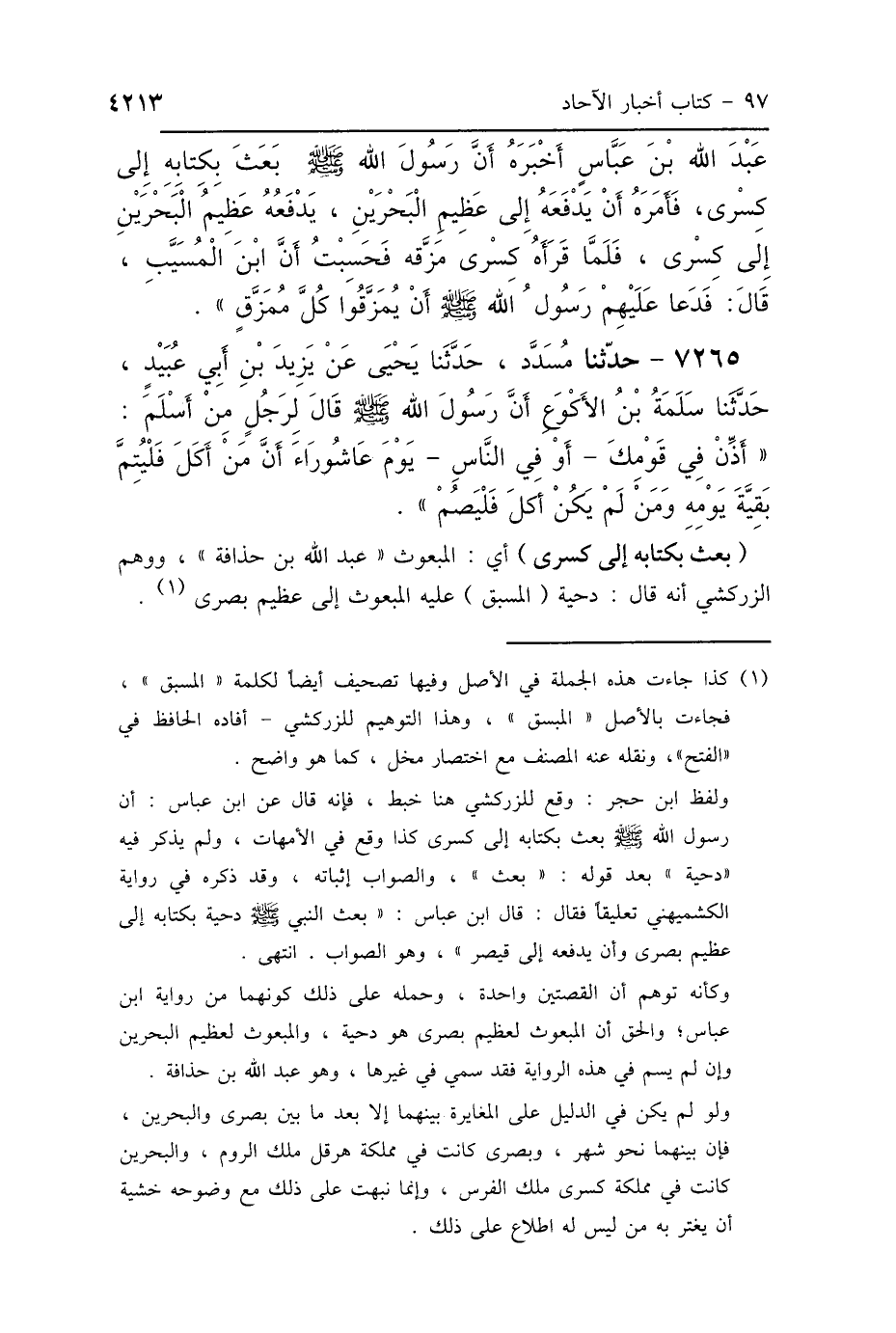 عَبْدَ اللَّهِ بْنَ عَبَّاسٍ أَخْبَرَهُ: أَنَّ رَسُولَ اللَّهِ صَلَّى اللهُ عَلَيْهِ وَسَلَّمَ «بَعَثَ بِكِتَابِهِ إِلَى كِسْرَى، فَأَمَرَهُ أَنْ يَدْفَعَهُ إِلَى عَظِيمِ البَحْرَيْنِ، يَدْفَعُهُ عَظِيمُ البَحْرَيْنِ إِلَى كِسْرَى»، فَلَمَّا قَرَأَهُ كِسْرَى مَزَّقَهُ، فَحَسِبْتُ أَنَّ ابْنَ المُسَيِّبِ قَالَ: فَدَعَا عَلَيْهِمْ رَسُولُ اللَّهِ صَلَّى اللهُ عَلَيْهِ وَسَلَّمَ: «أَنْ يُمَزَّقُوا كُلَّ مُمَزَّقٍ».